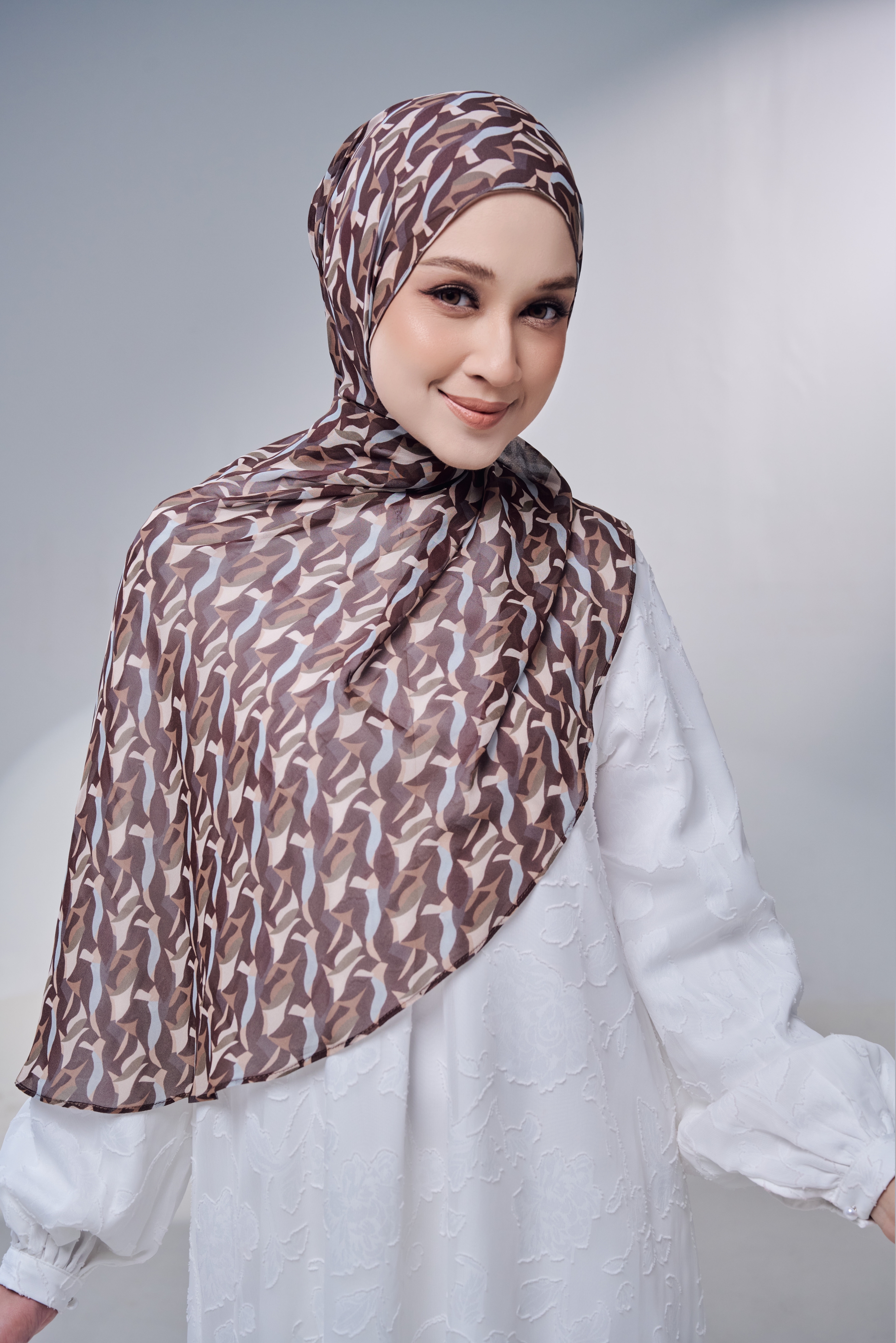 Cutting hujung berlengkung (curve) memudahkan shawl dibentuk dan memastikan ia terletak rapi sepanjang hari. Dengan kemasan yang tidak terlalu jarang, ia memberi keseimbangan antara keselesaan dan keyakinan setiap kali dipakai