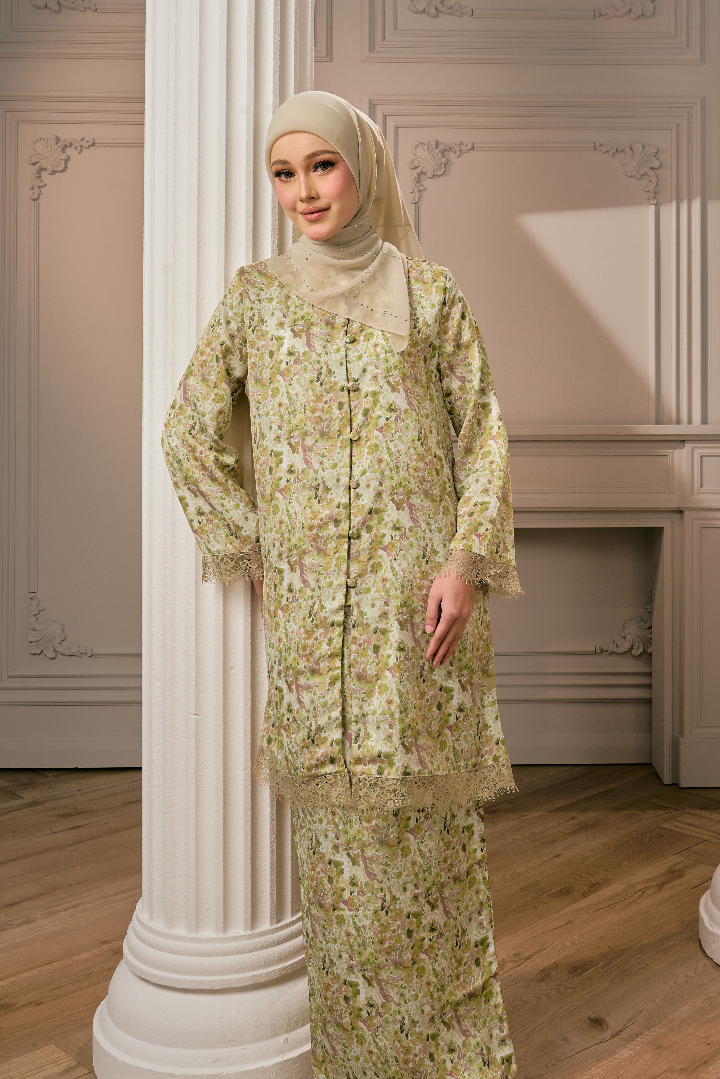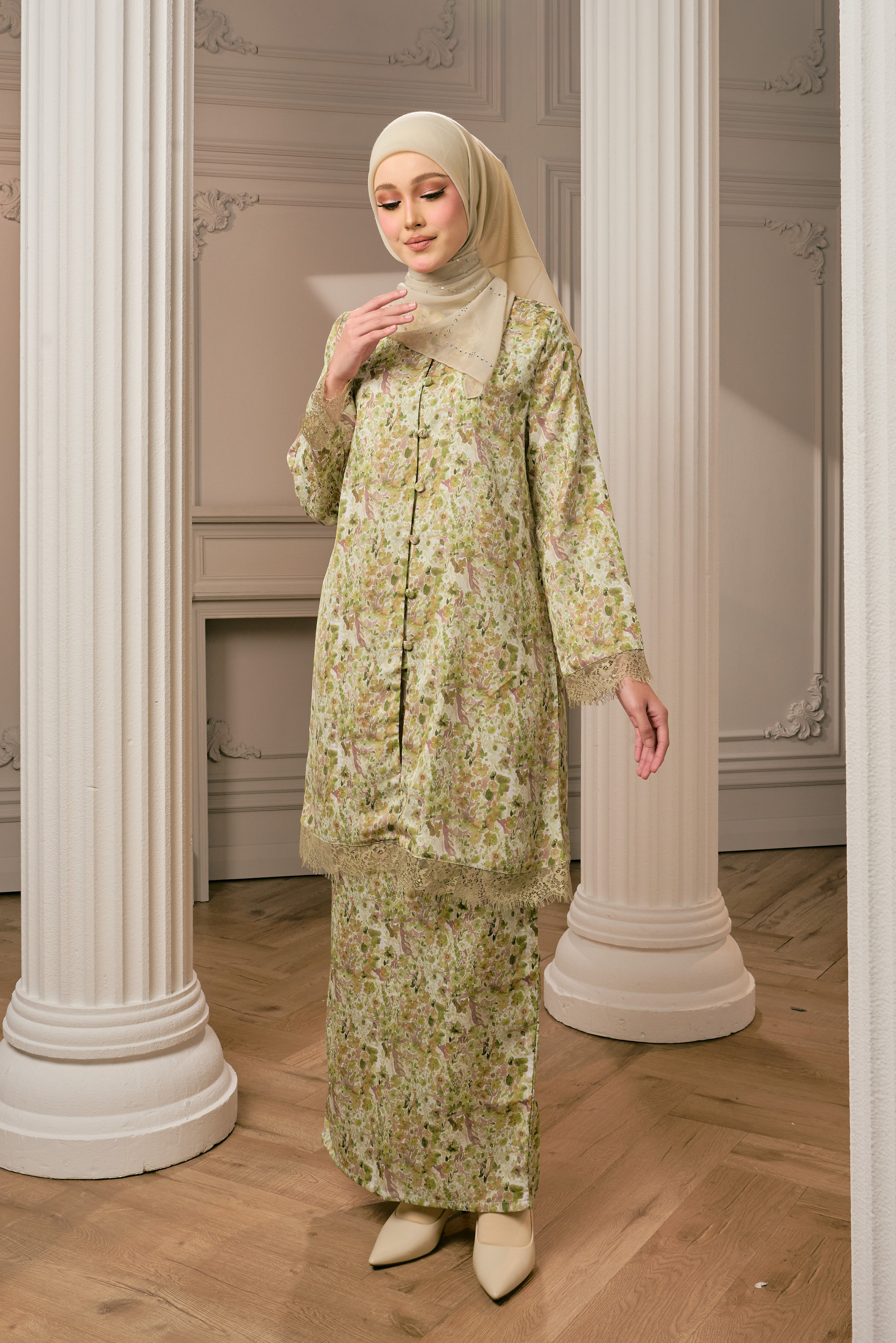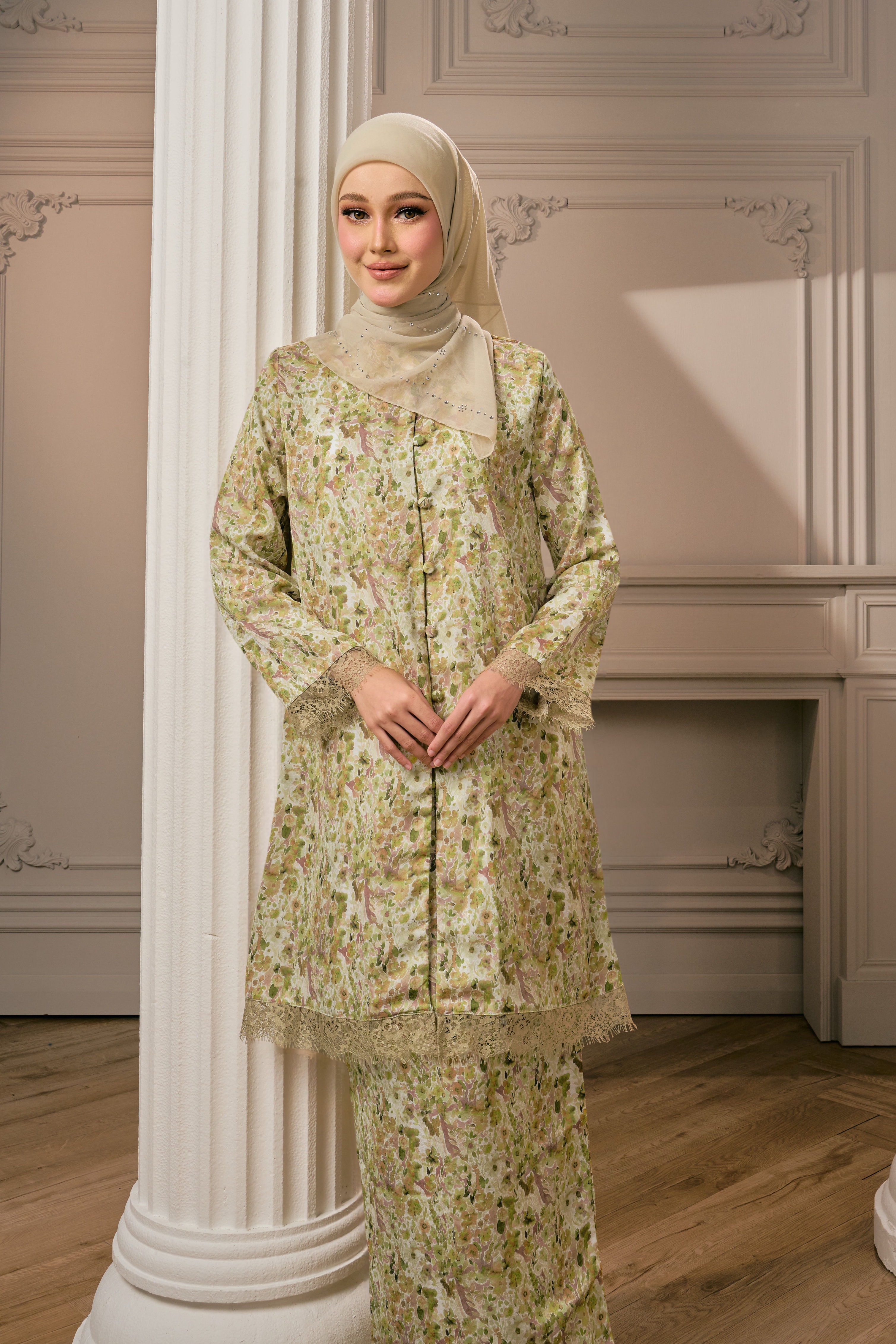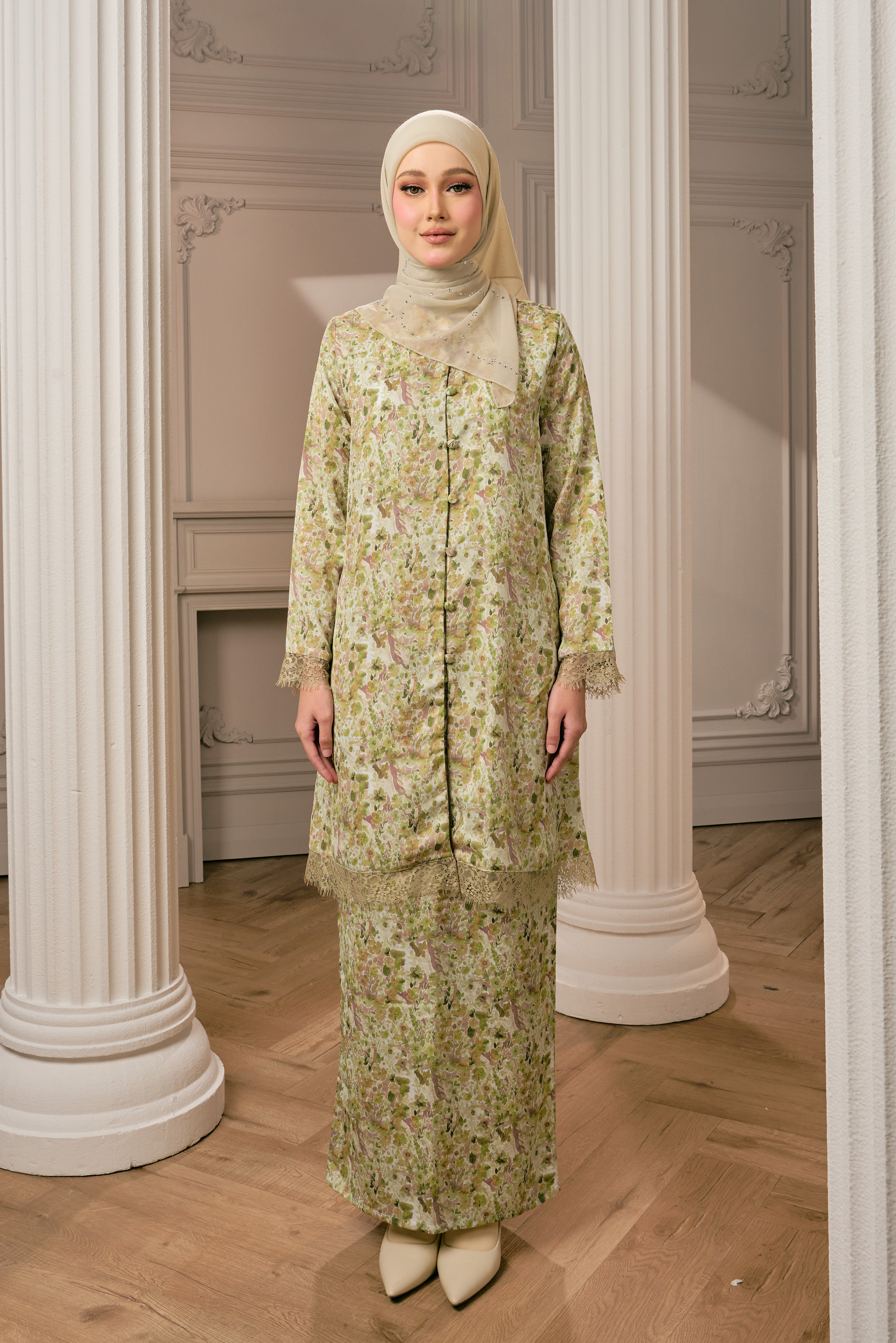 CEMPAKA KURUNGTerinspirasi daripada kelembutan bunga cempaka yang mekar dalam diam, Cempaka Kurung menzahirkan keanggunan klasik dengan sentuhan moden. Motif floral yang halus mengalir indah di atas fabrik, menyerlahkan aura feminin yang sopan namun memikat.