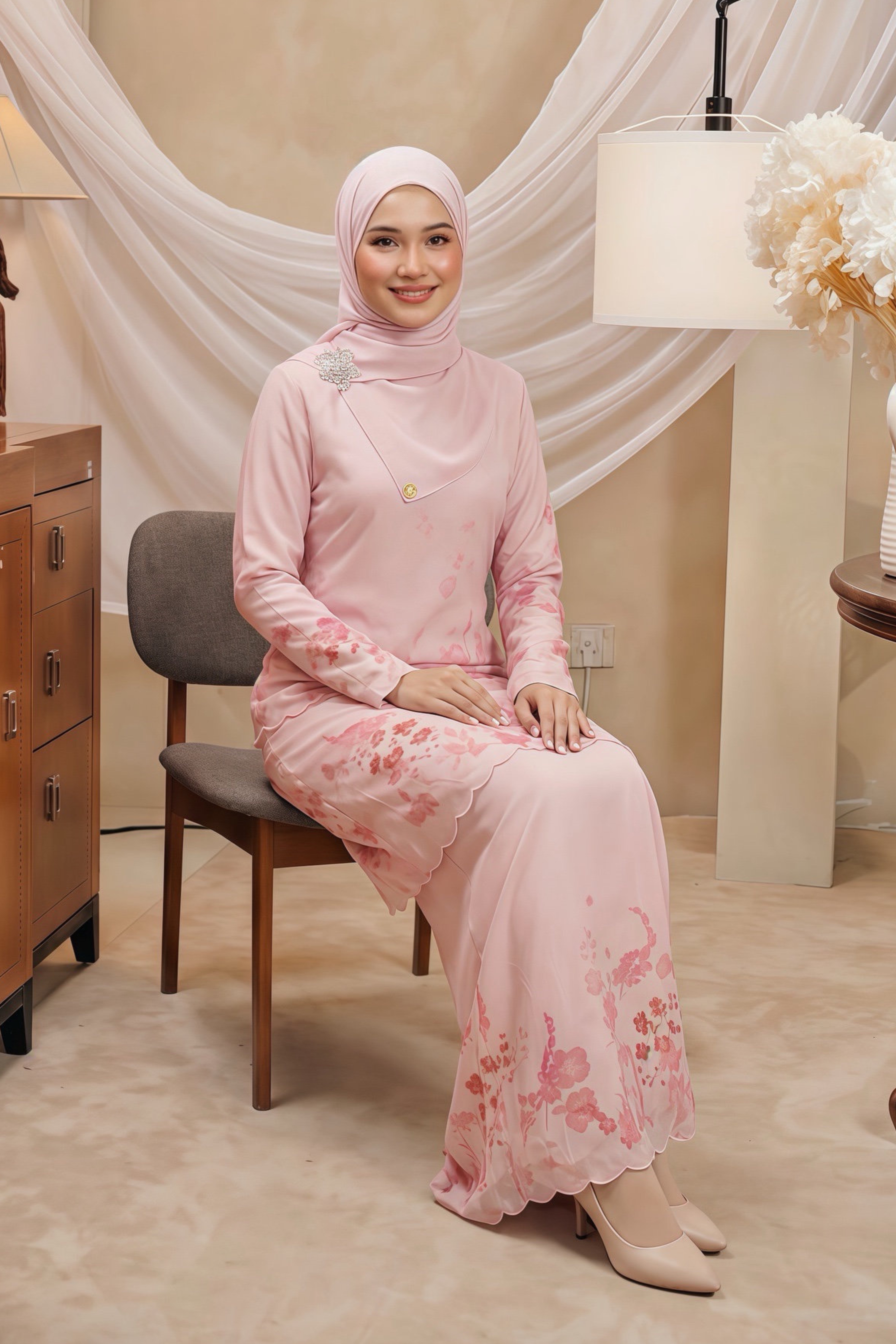 Embrace timeless elegance with the Darla Kurung, featuring scalloped hems and graceful floral prints