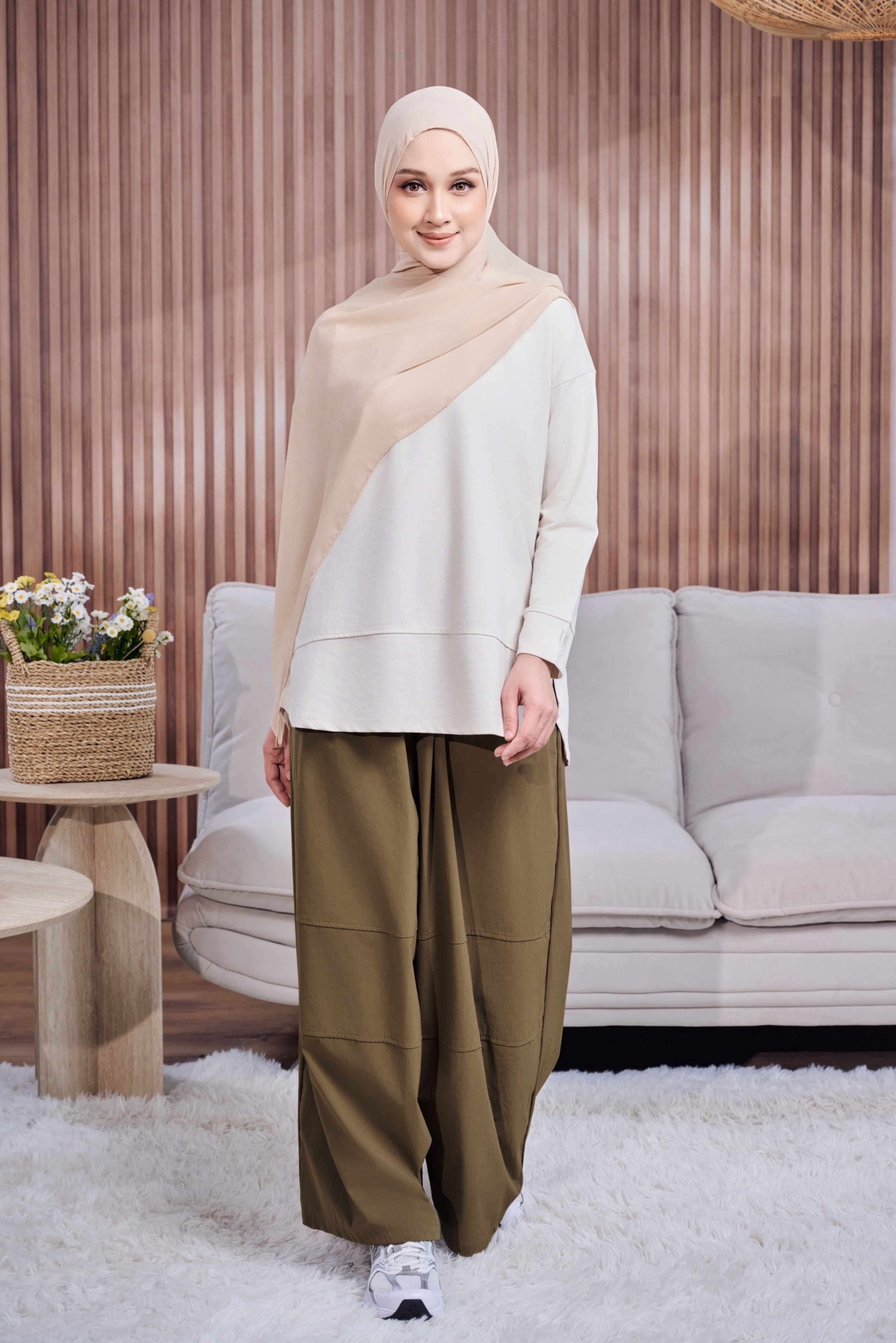 Potongan baggy yang loose & flowy tetapi tetap structured memberikan pergerakan yang cantik, sambil mengekalkan look yang polished dan premium — tak nampak selekeh walaupun tanpa effort.