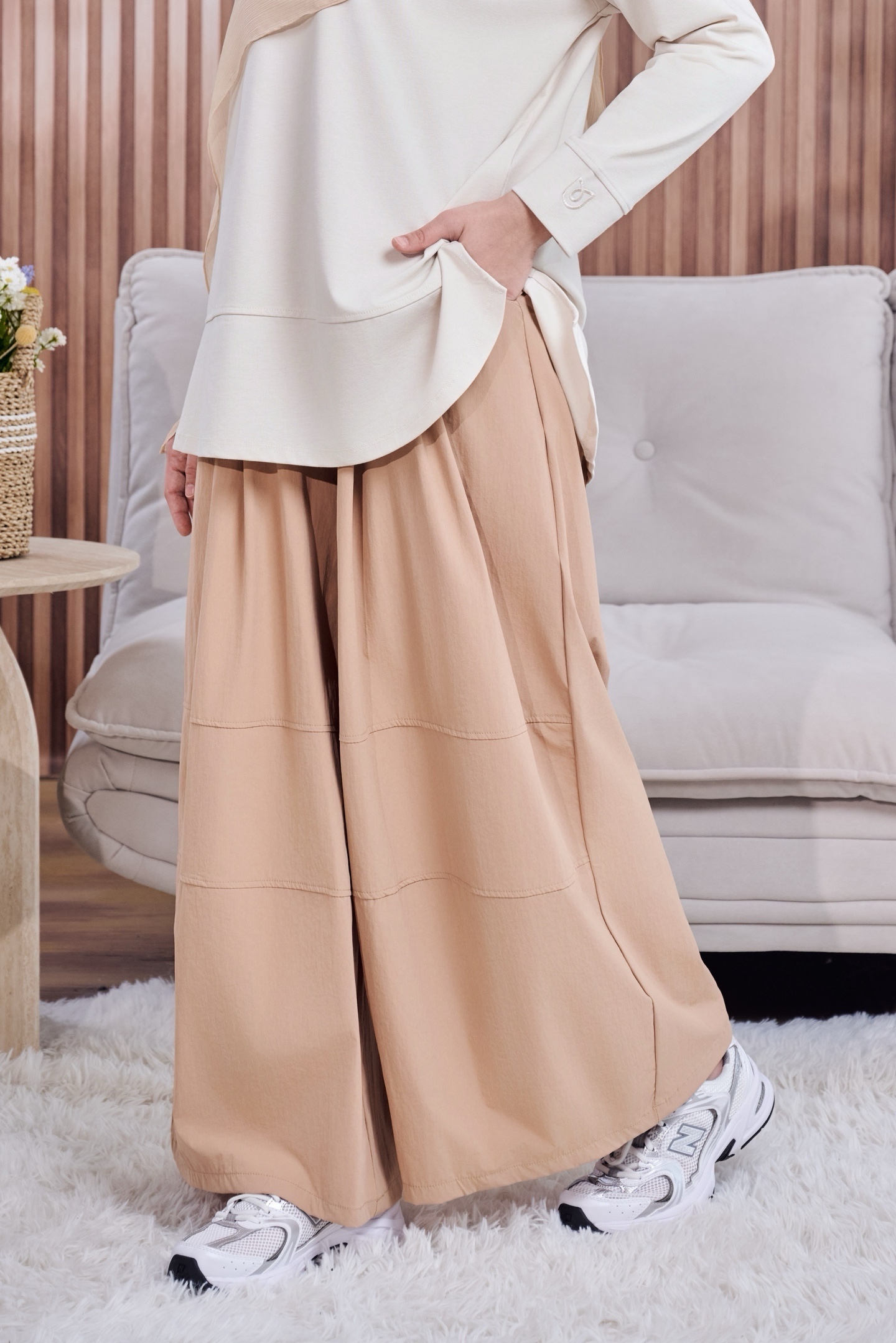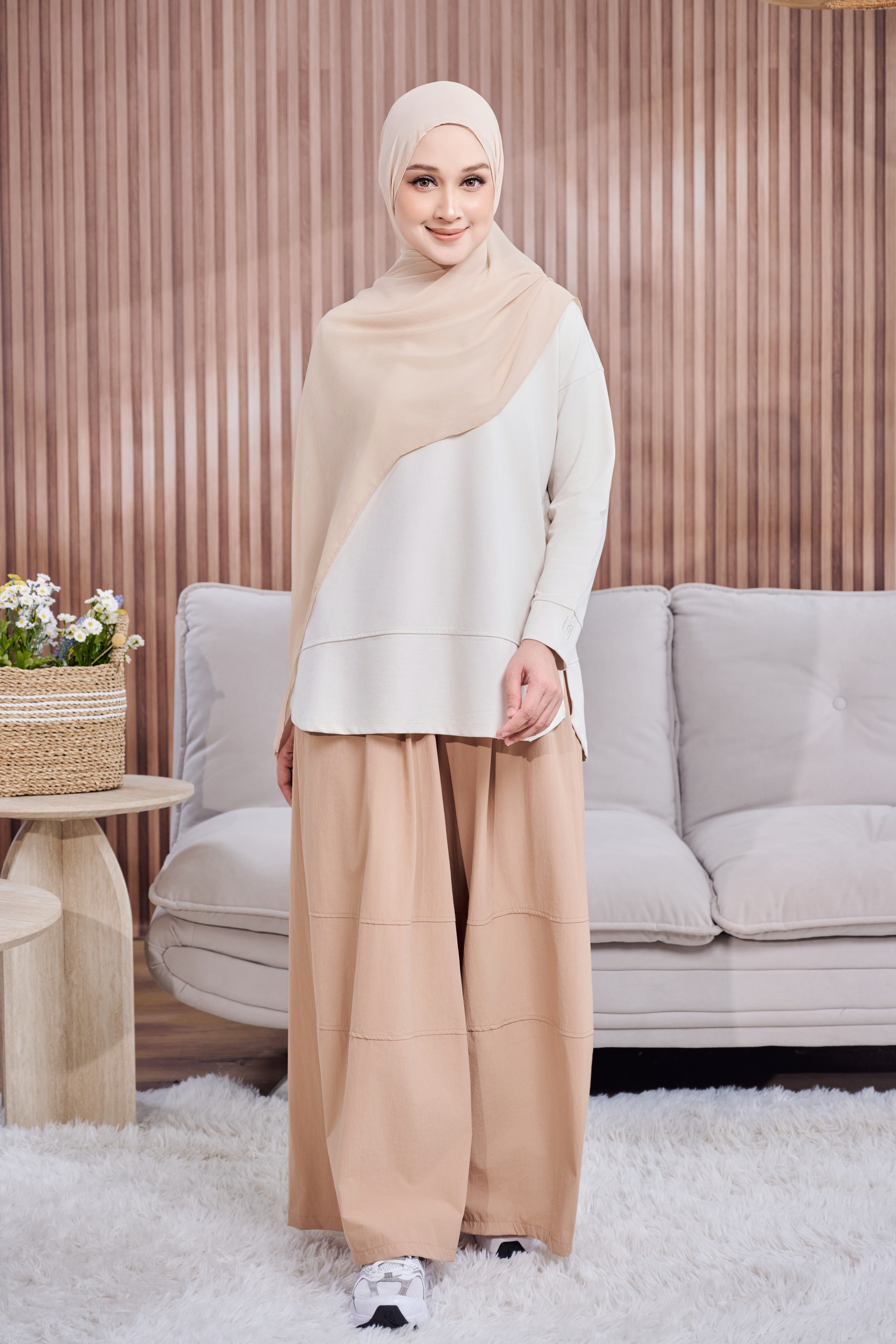 Potongan baggy yang loose & flowy tetapi tetap structured memberikan pergerakan yang cantik, sambil mengekalkan look yang polished dan premium — tak nampak selekeh walaupun tanpa effort.