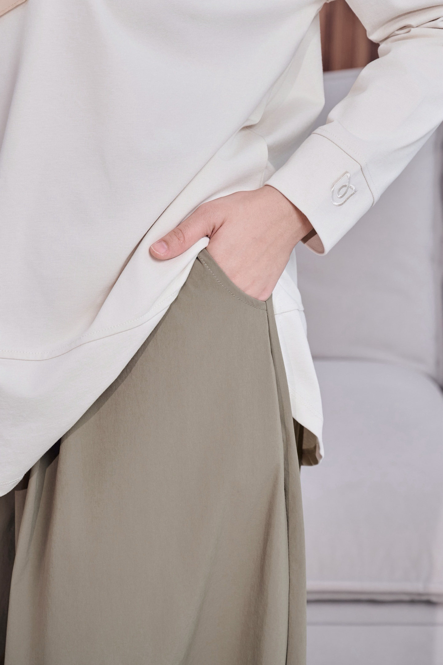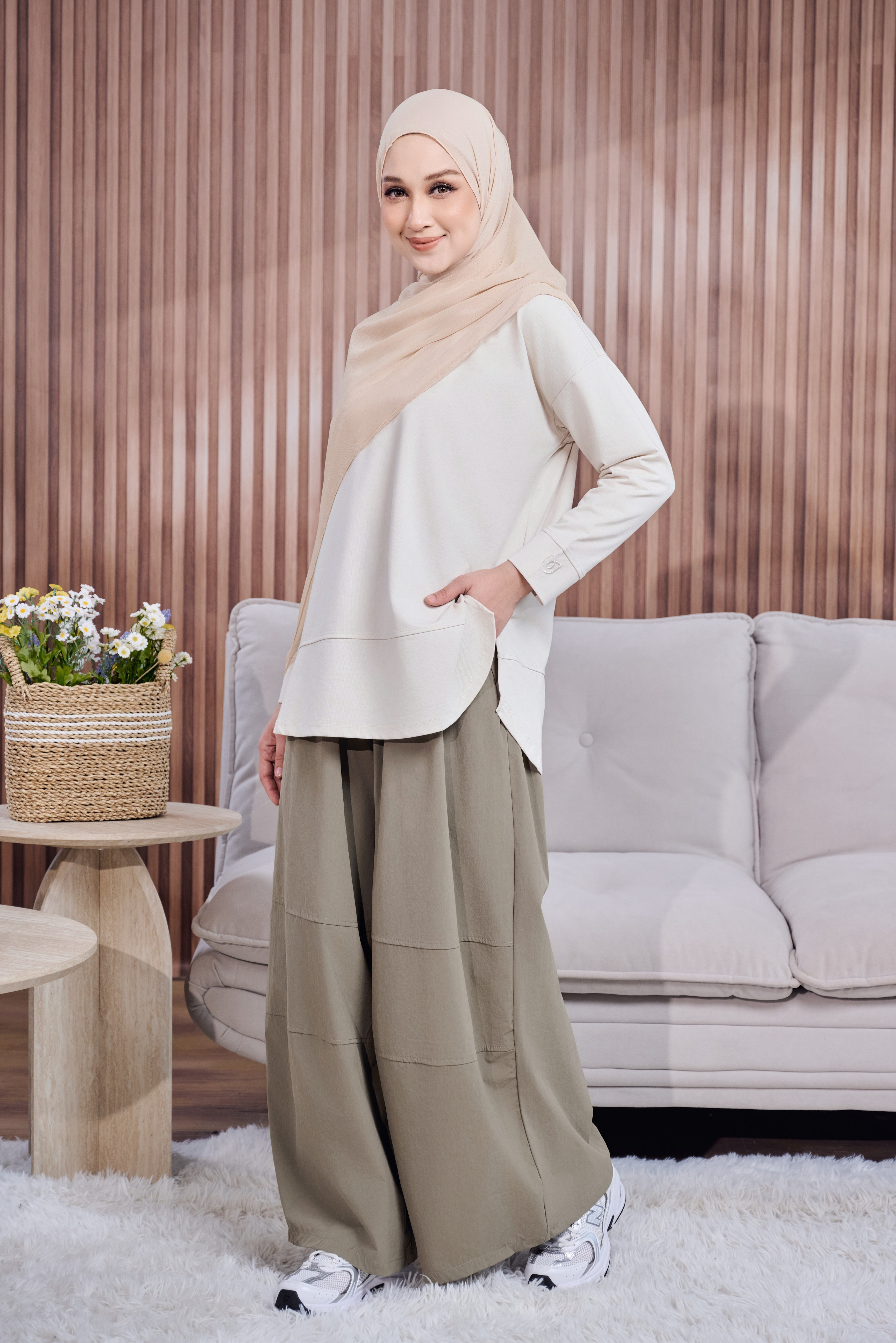 Potongan baggy yang loose & flowy tetapi tetap structured memberikan pergerakan yang cantik, sambil mengekalkan look yang polished dan premium — tak nampak selekeh walaupun tanpa effort.