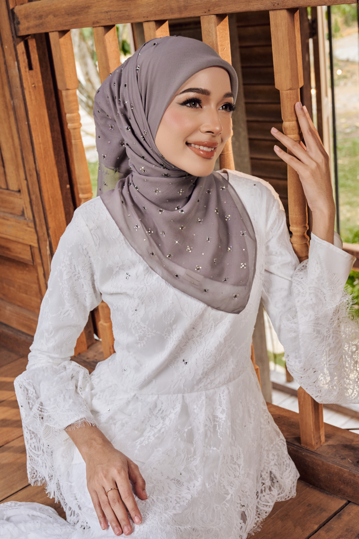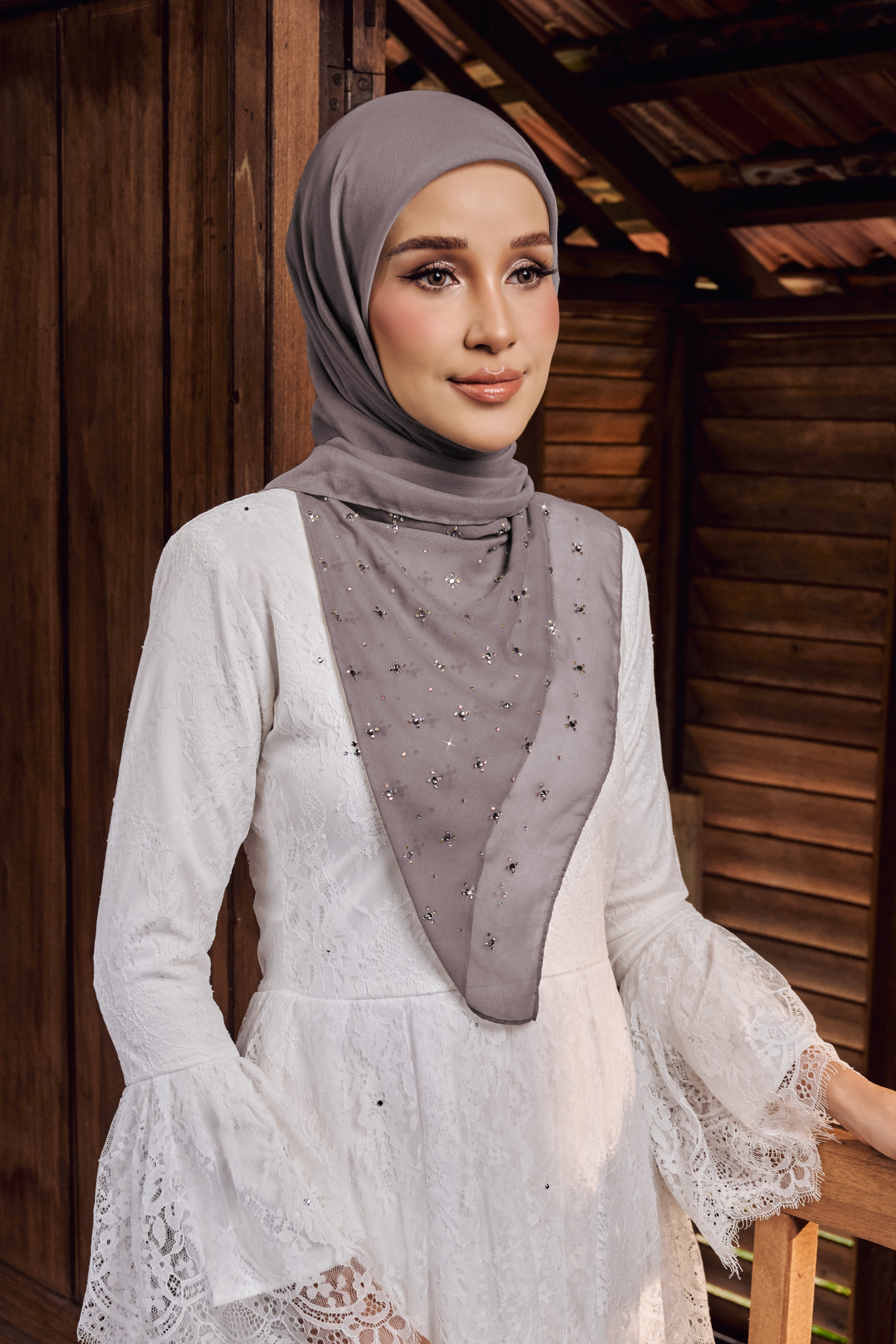 Dihiasi dengan susunan rhinestone crystal halus berkilau yang disusun dalam pattern bunga kecil empat kelopak, tersusun sekata dan seimbang di seluruh permukaan bawal. Setiap motif dihiasi titik kristal di tengah, memberi efek taburan bintang yang tampak lembut tetapi tetap menyerlah apabila terkena cahaya.