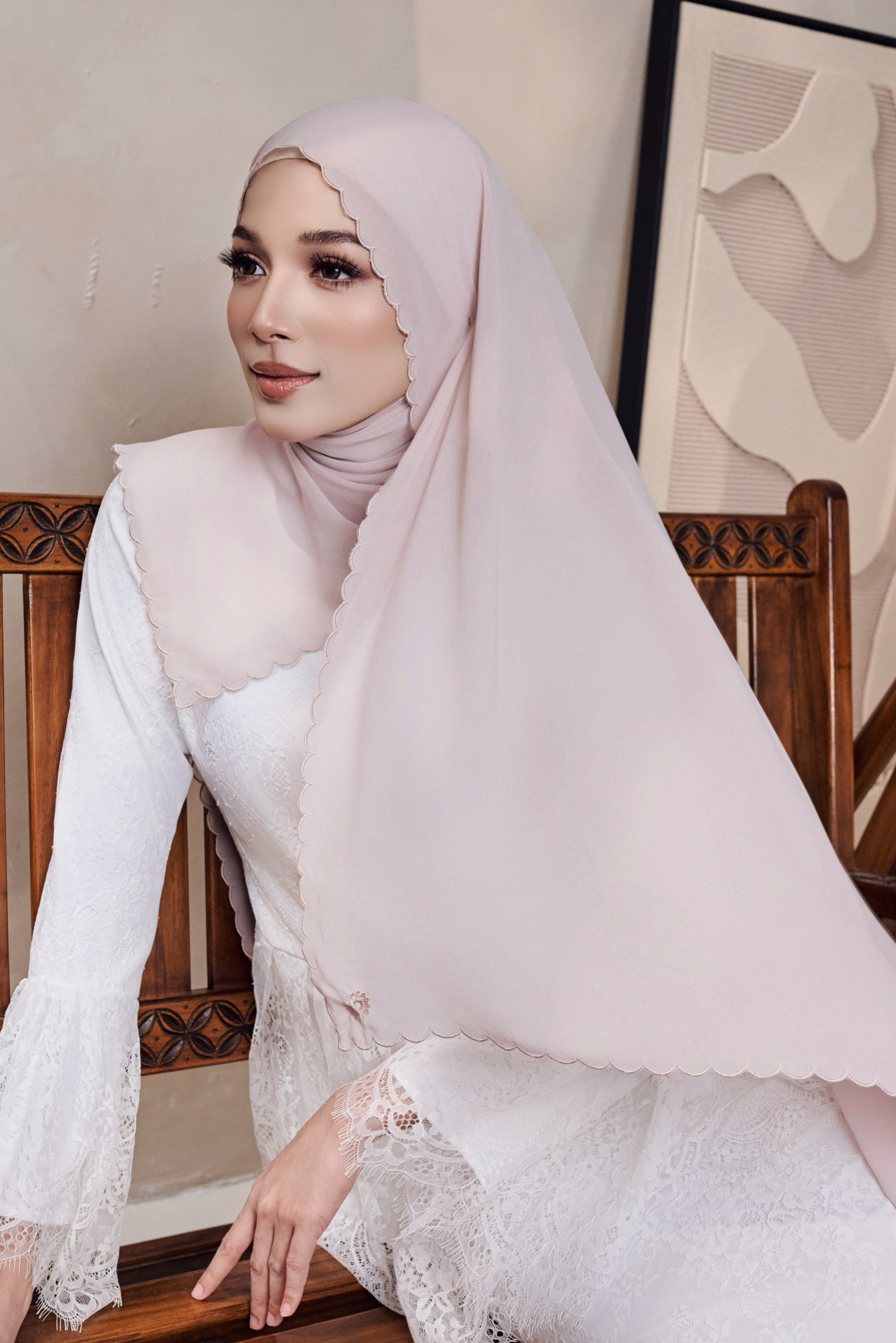 Shawl Sulam Kaseh tampil dengan sentuhan sulaman halus di bahagian tepi untuk aura feminin yang manis dan eksklusif.