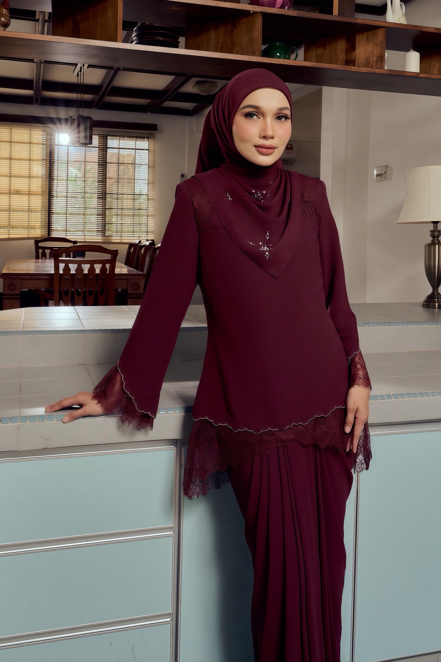 Bahagian atas dihiasi dengan sulaman halus dan lace eksklusif, menambah elemen mewah tanpa kelihatan berlebihan. Potongan kemas dan elegan ini sesuai untuk wanita yang menggemari baju kurung moden, baju kurung elegan, dan baju kurung lace yang sopan serta anggun.