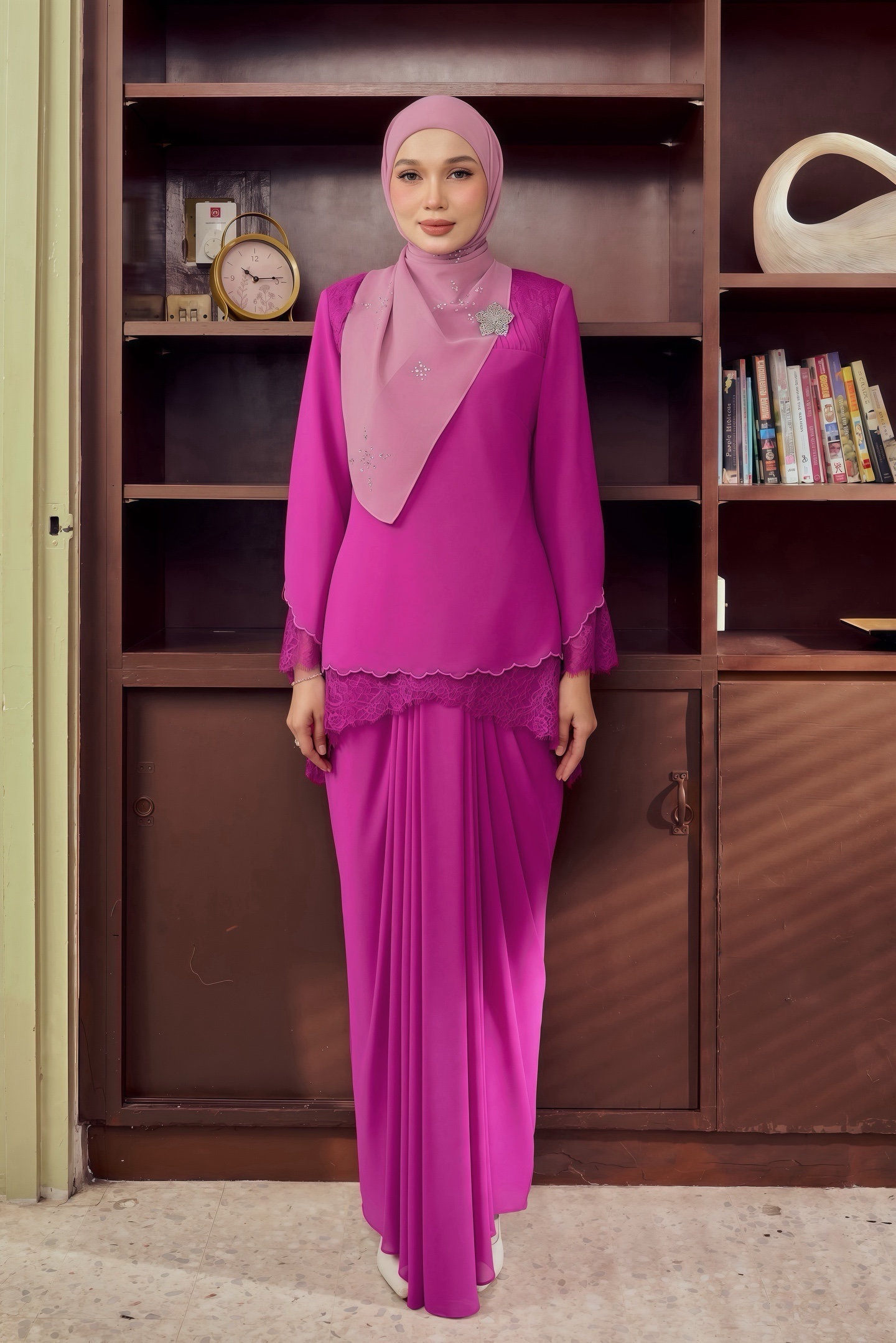 Bahagian atas dihiasi dengan sulaman halus dan lace eksklusif, menambah elemen mewah tanpa kelihatan berlebihan. Potongan kemas dan elegan ini sesuai untuk wanita yang menggemari baju kurung moden, baju kurung elegan, dan baju kurung lace yang sopan serta anggun.