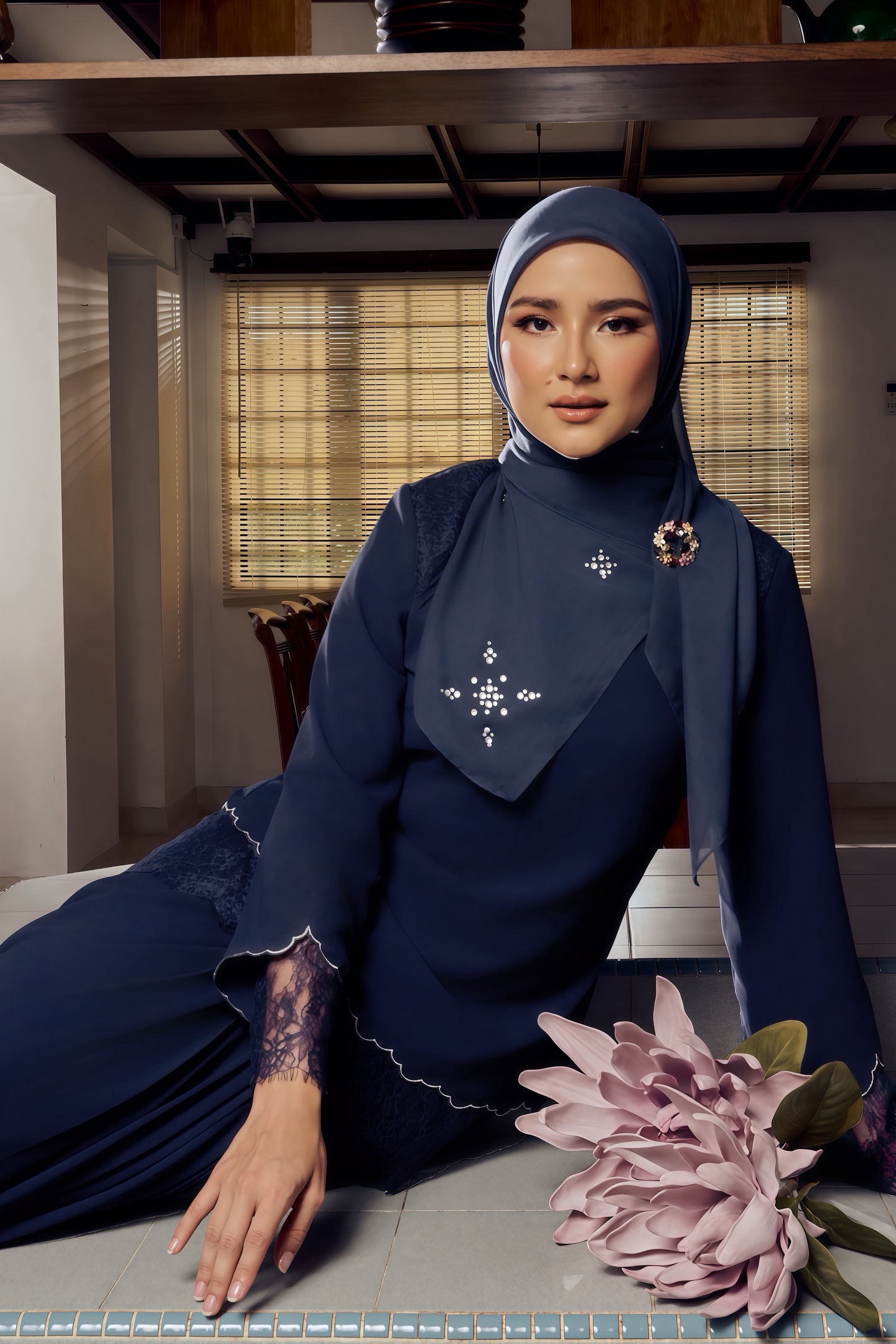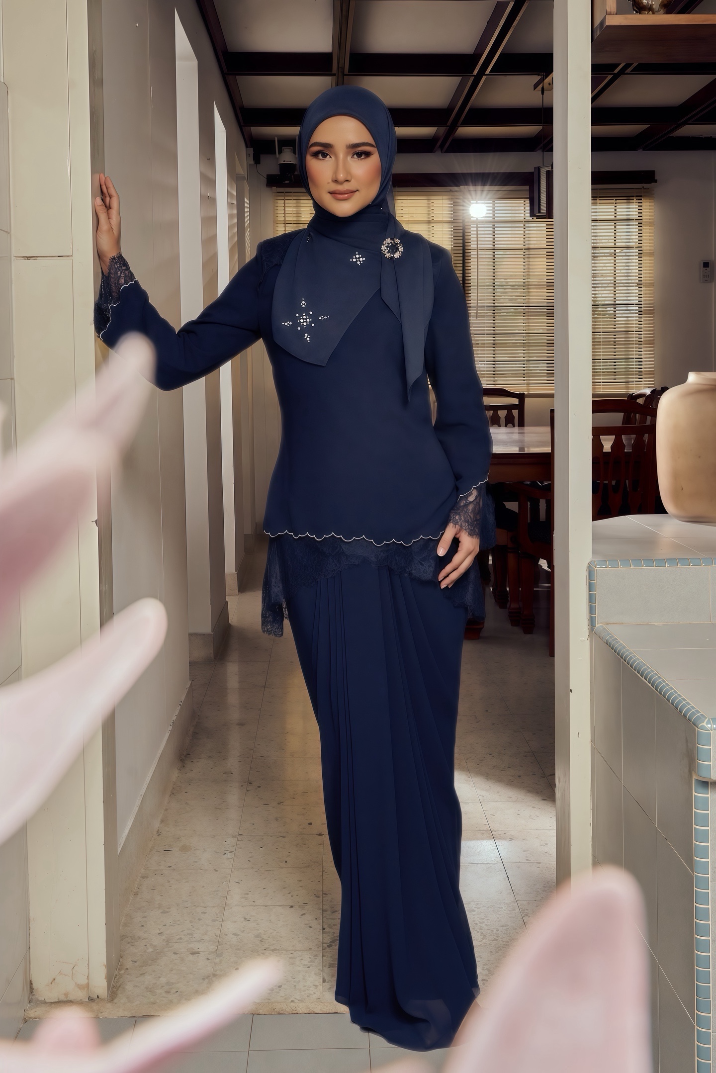 Bahagian atas dihiasi dengan sulaman halus dan lace eksklusif, menambah elemen mewah tanpa kelihatan berlebihan. Potongan kemas dan elegan ini sesuai untuk wanita yang menggemari baju kurung moden, baju kurung elegan, dan baju kurung lace yang sopan serta anggun.