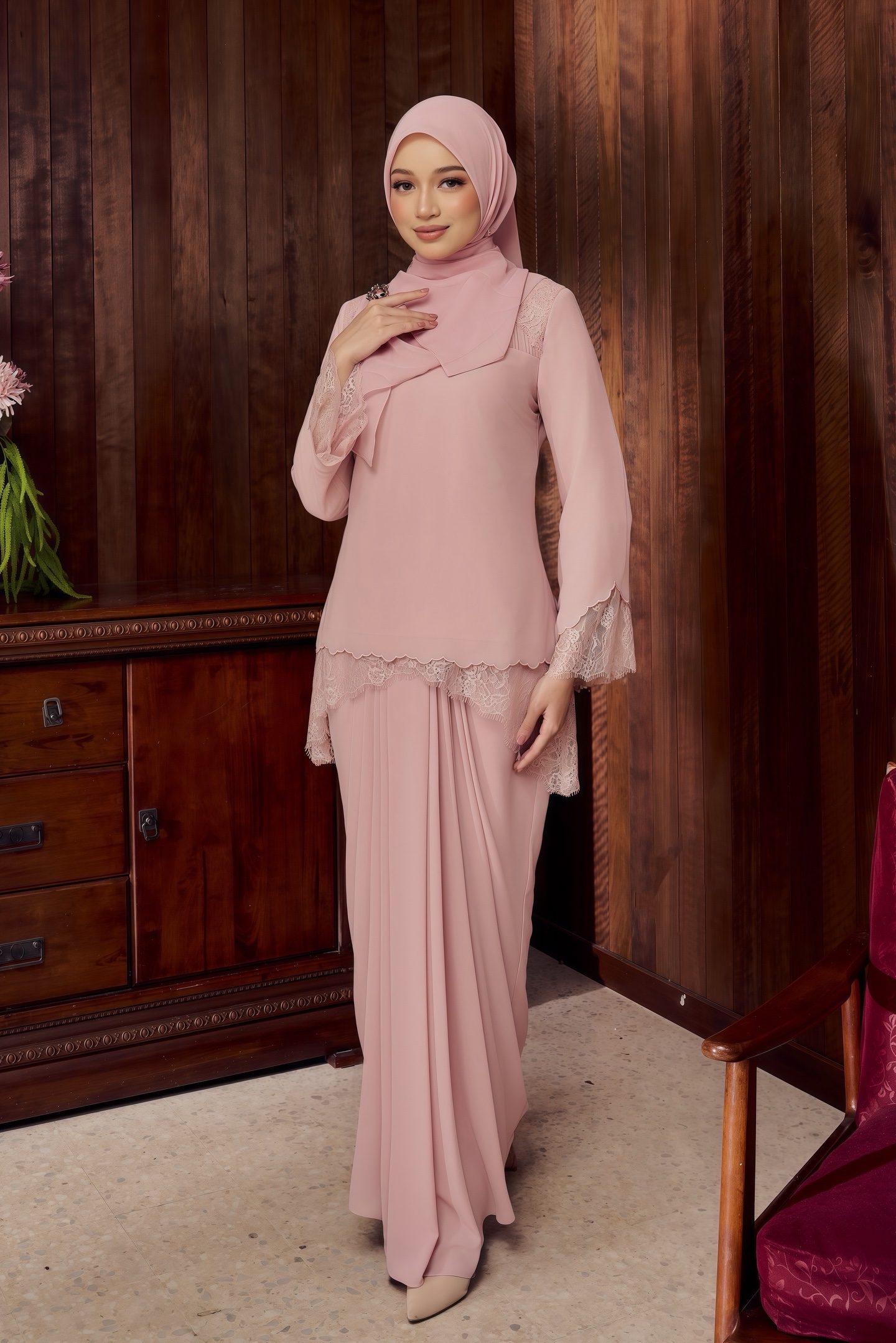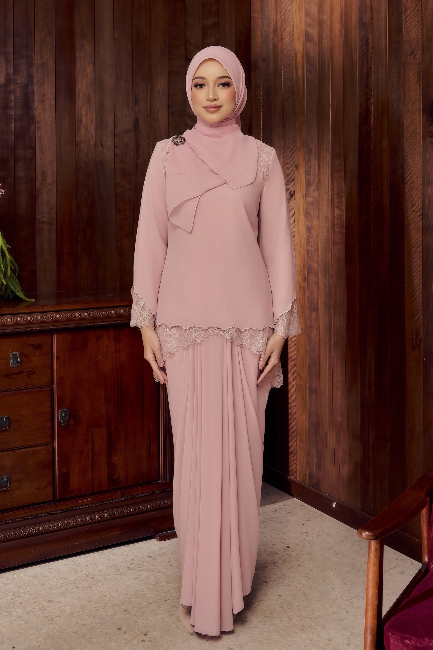 Bahagian atas dihiasi dengan sulaman halus dan lace eksklusif, menambah elemen mewah tanpa kelihatan berlebihan. Potongan kemas dan elegan ini sesuai untuk wanita yang menggemari baju kurung moden, baju kurung elegan, dan baju kurung lace yang sopan serta anggun.