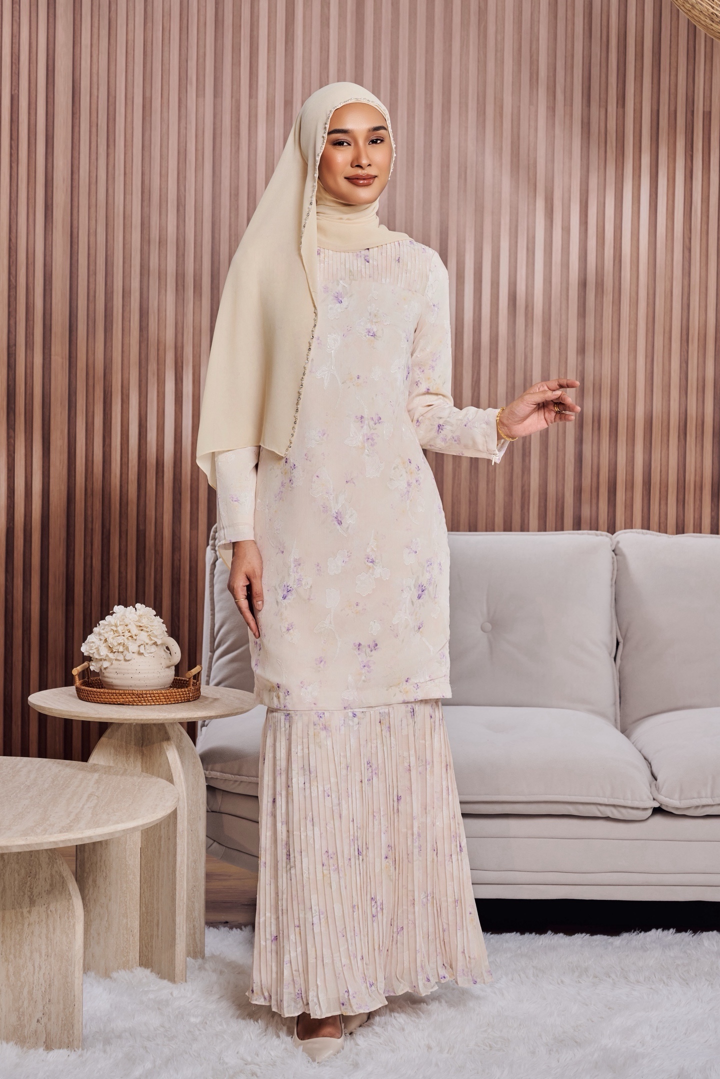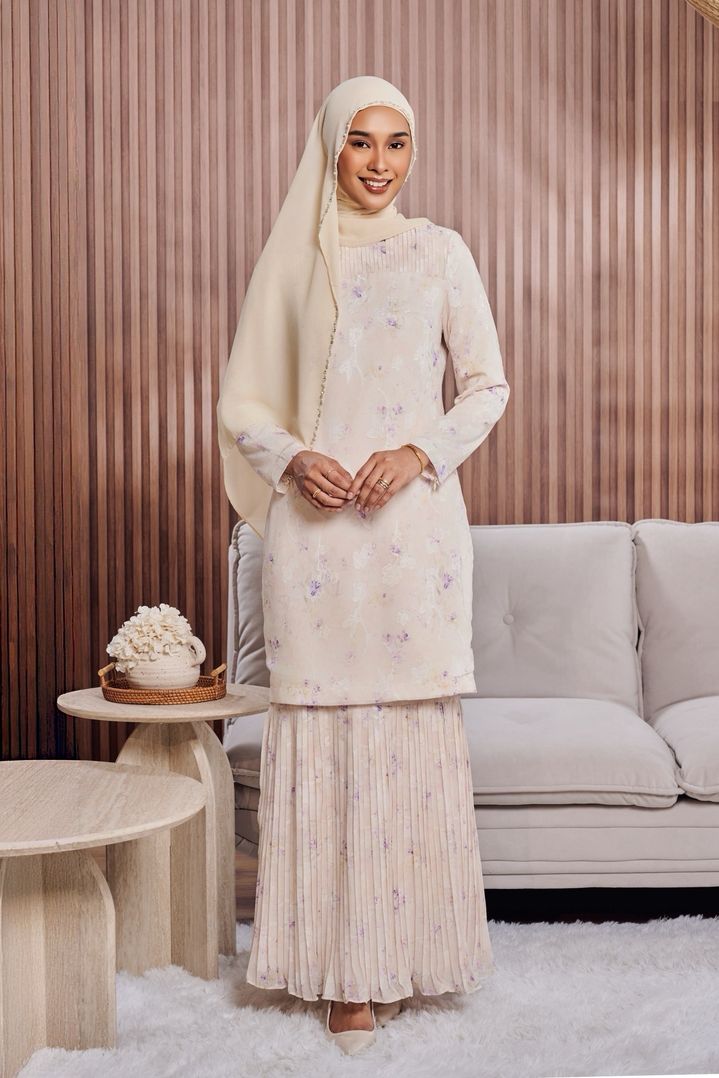 LUNARA Kurung Moden hadir dengan sentuhan floral printed yang lembut dan eksklusif, menggunakan fabrik chiffon jacquard bertekstur yang memberi jatuhan cantik serta flow yang anggun setiap kali melangkah. Teksturnya halus, ringan dan terlihat refined tanpa perlu berlebihan.