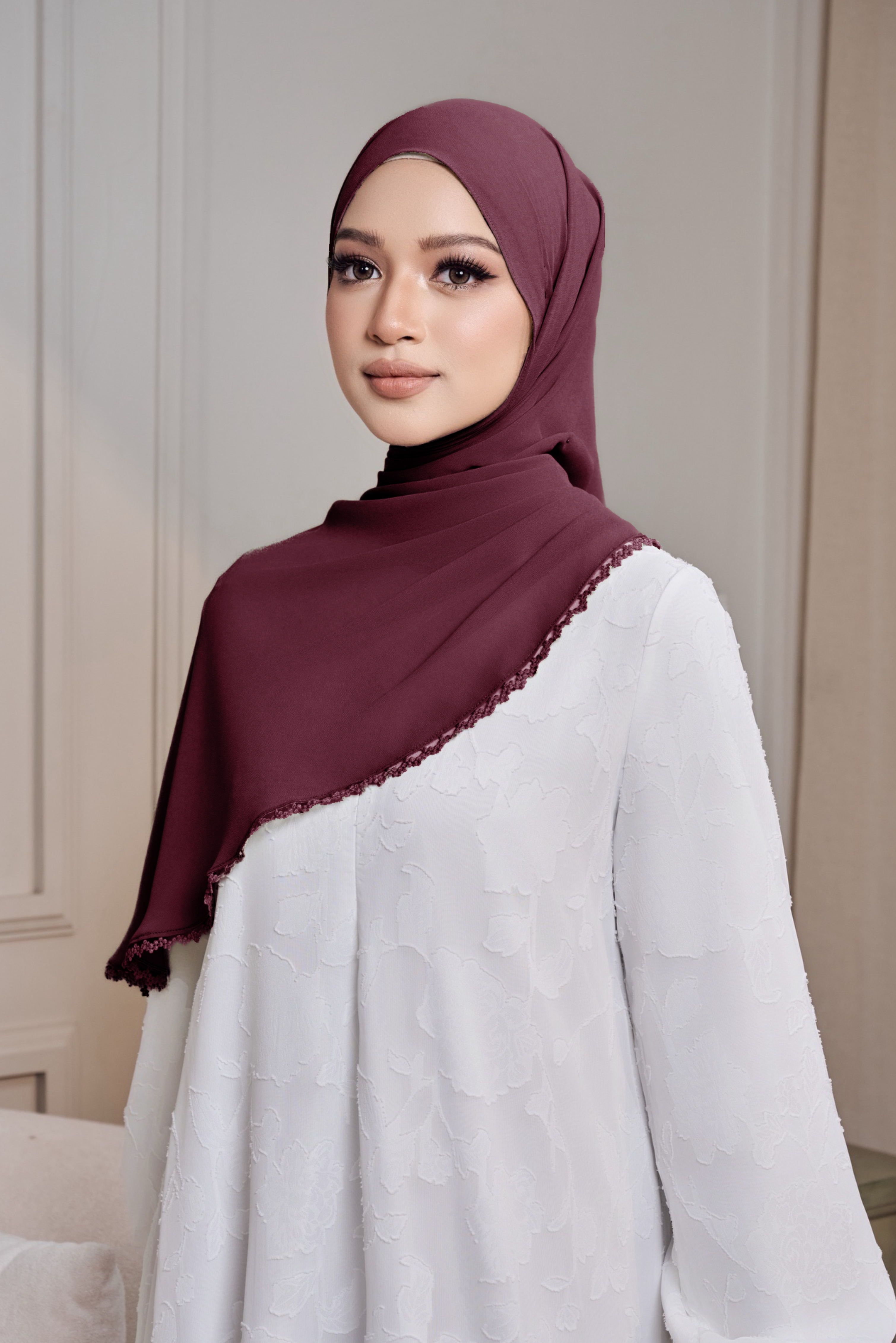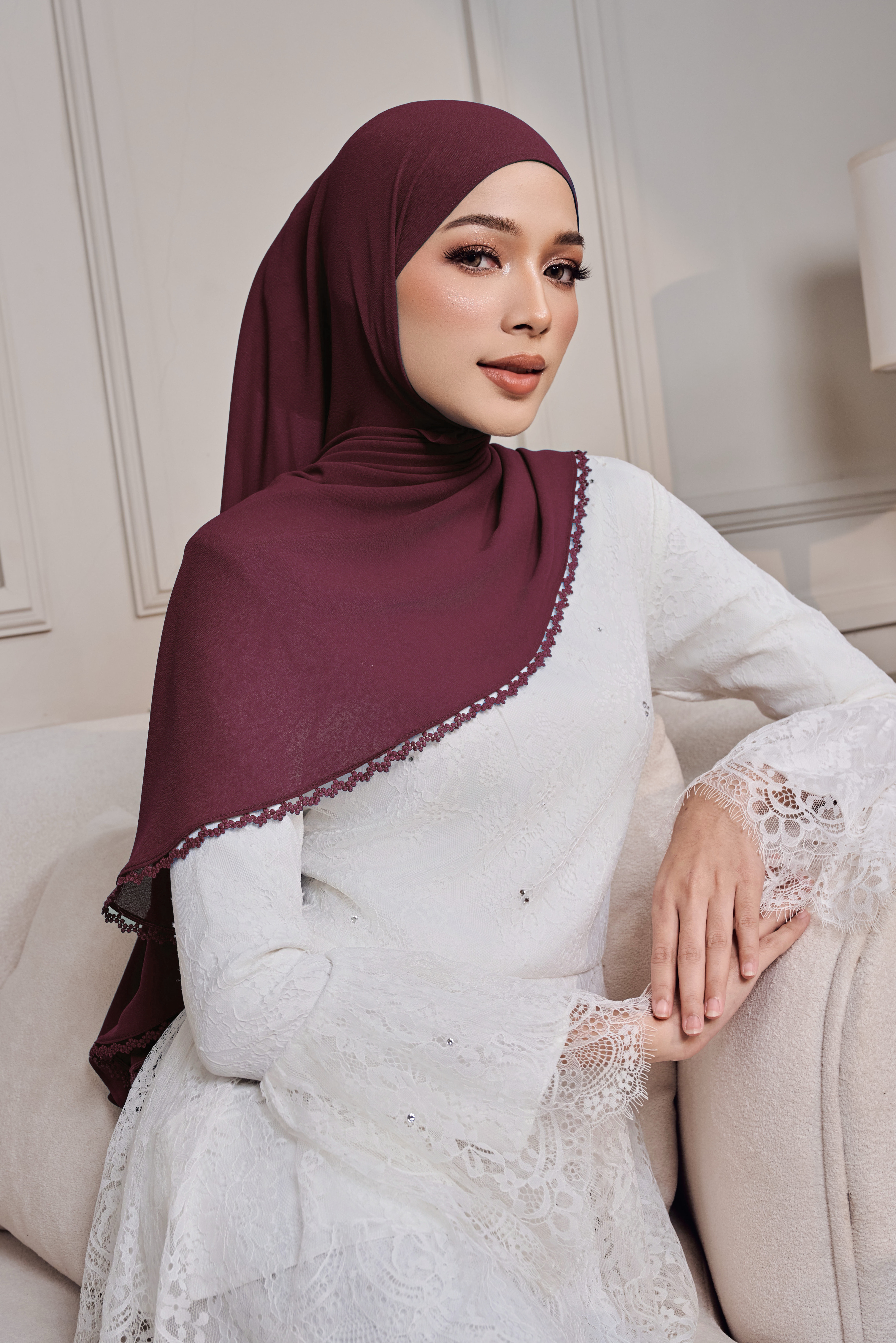Keistimewaan shawl ini terletak pada lace trim detailing yang menghiasi bahagian tepi, memberikan sentuhan feminin yang lembut dan eksklusif. Kemasan baby seam finishing pula memastikan jahitan lebih halus, kemas dan tahan lama.