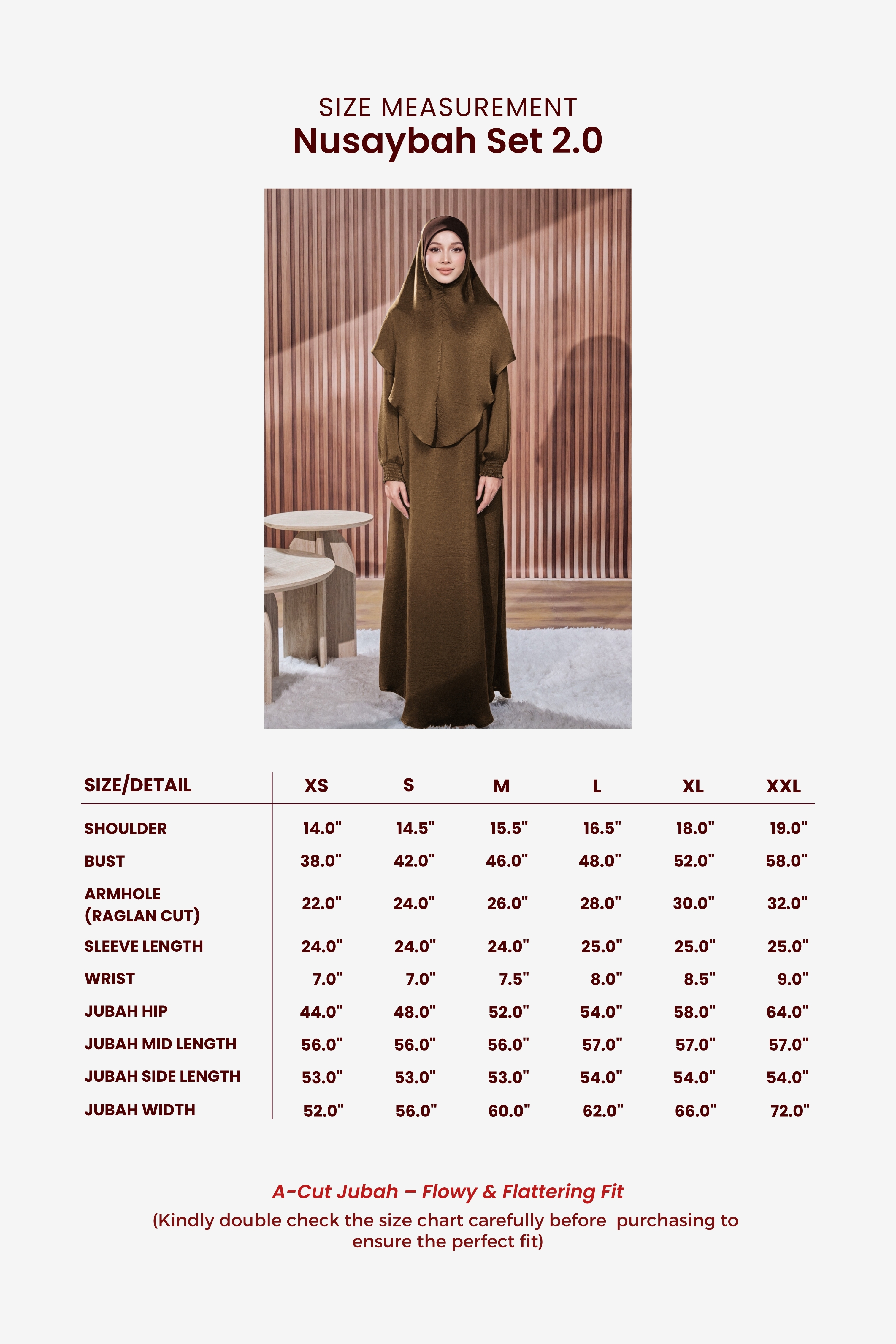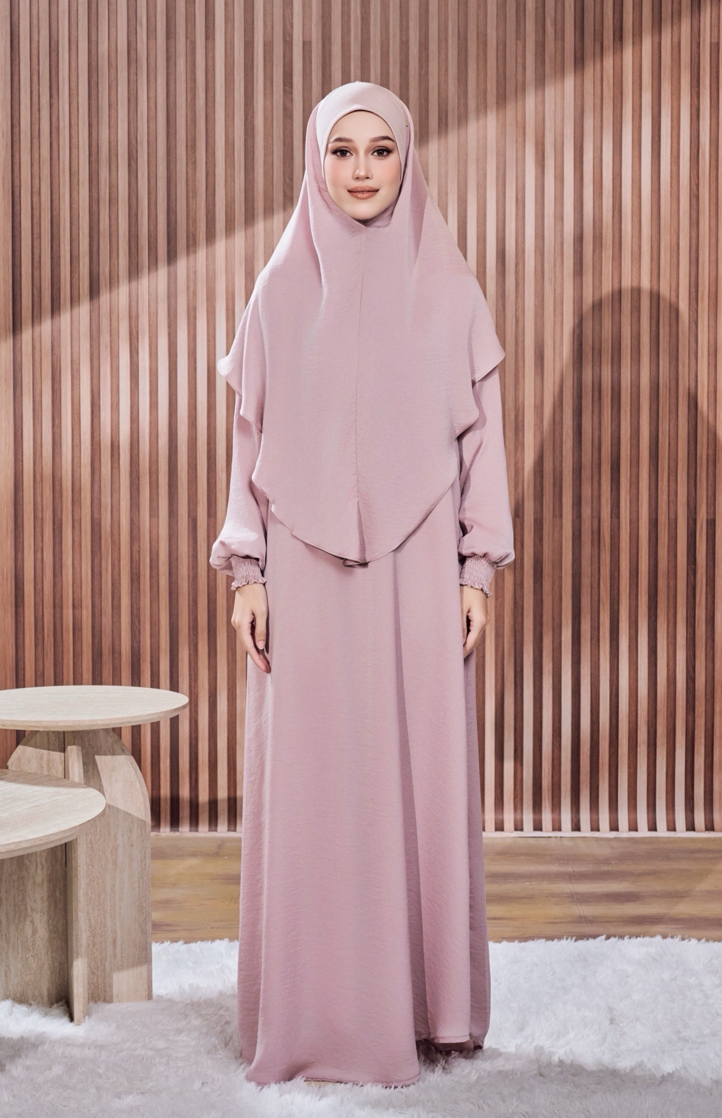 Lebih refined. Lebih flowy. Lebih eksklusif. Nusaybah Set 2.0 direka dengan sentuhan quiet luxury melalui gabungan Khimar Sarung bidang 55 (XL) & Jubah A-Cut versi lebih kembang — untuk wanita yang sukakan gaya sopan dengan aura premium tanpa berlebihan.