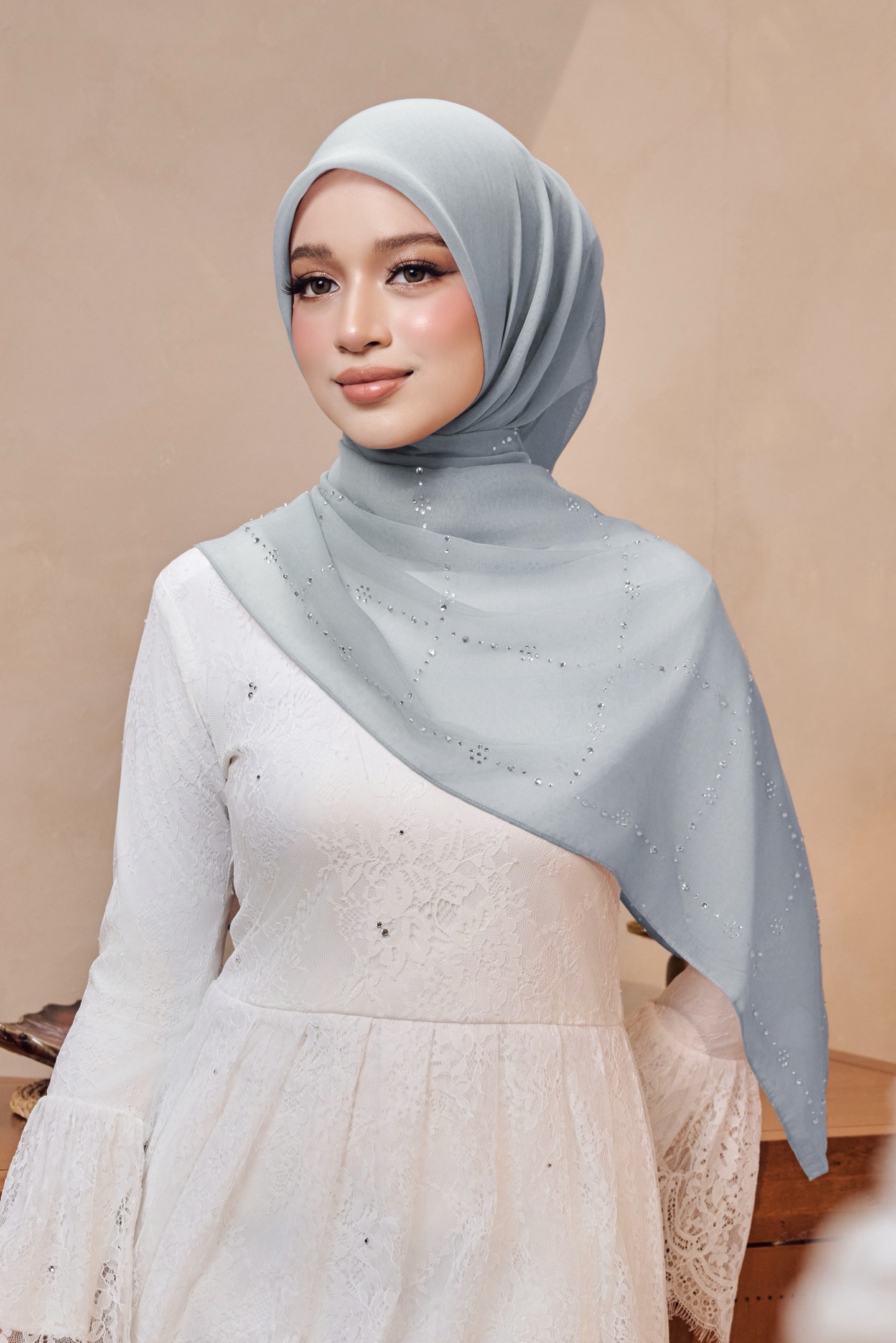 Perincian batu hotfix halus memberikan kilauan lembut yang menaikkan seri tanpa nampak berlebihan. Ditambah dengan jahitan baby seam, kemasan bawal kelihatan lebih kemas dan eksklusif.