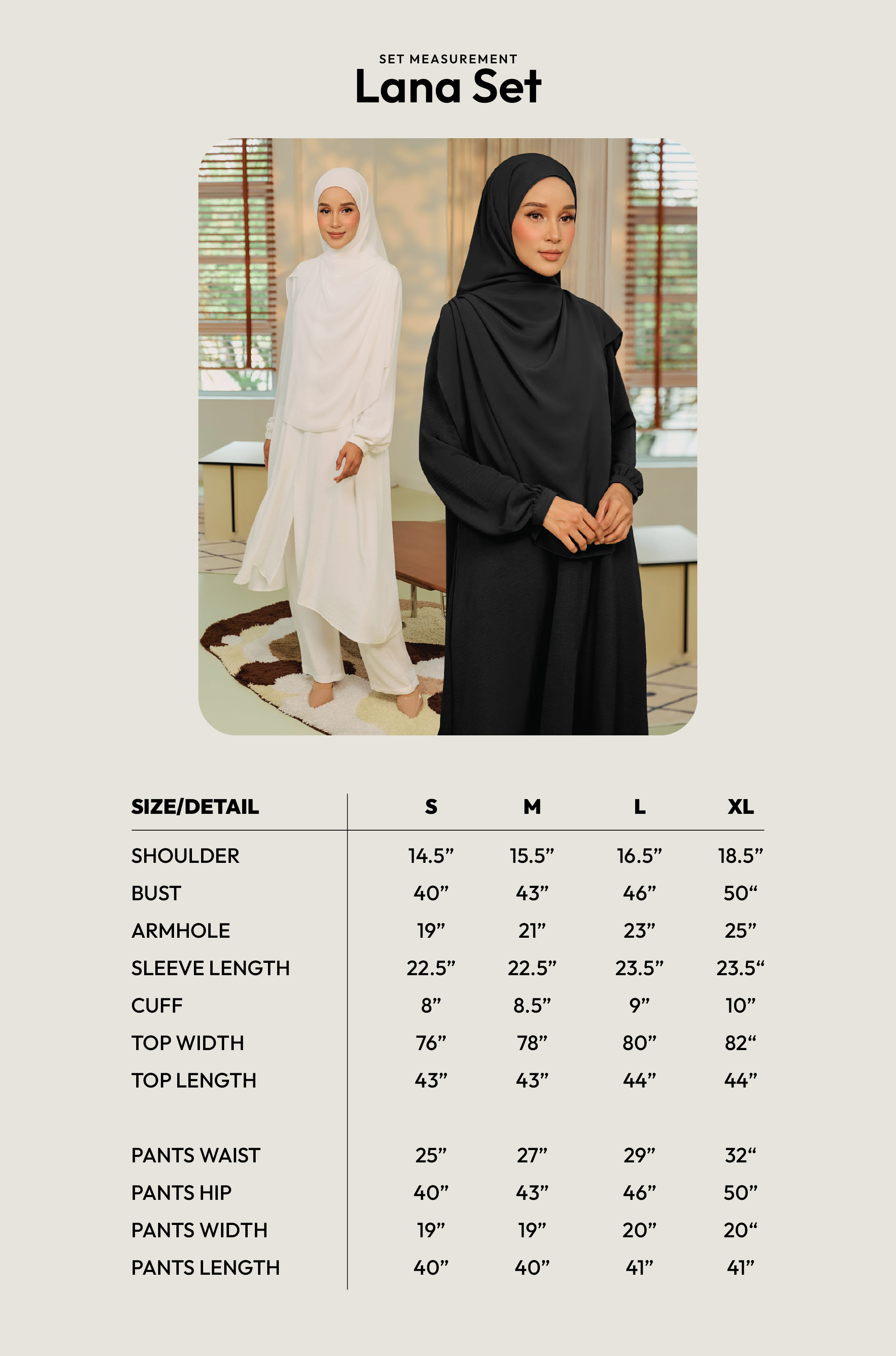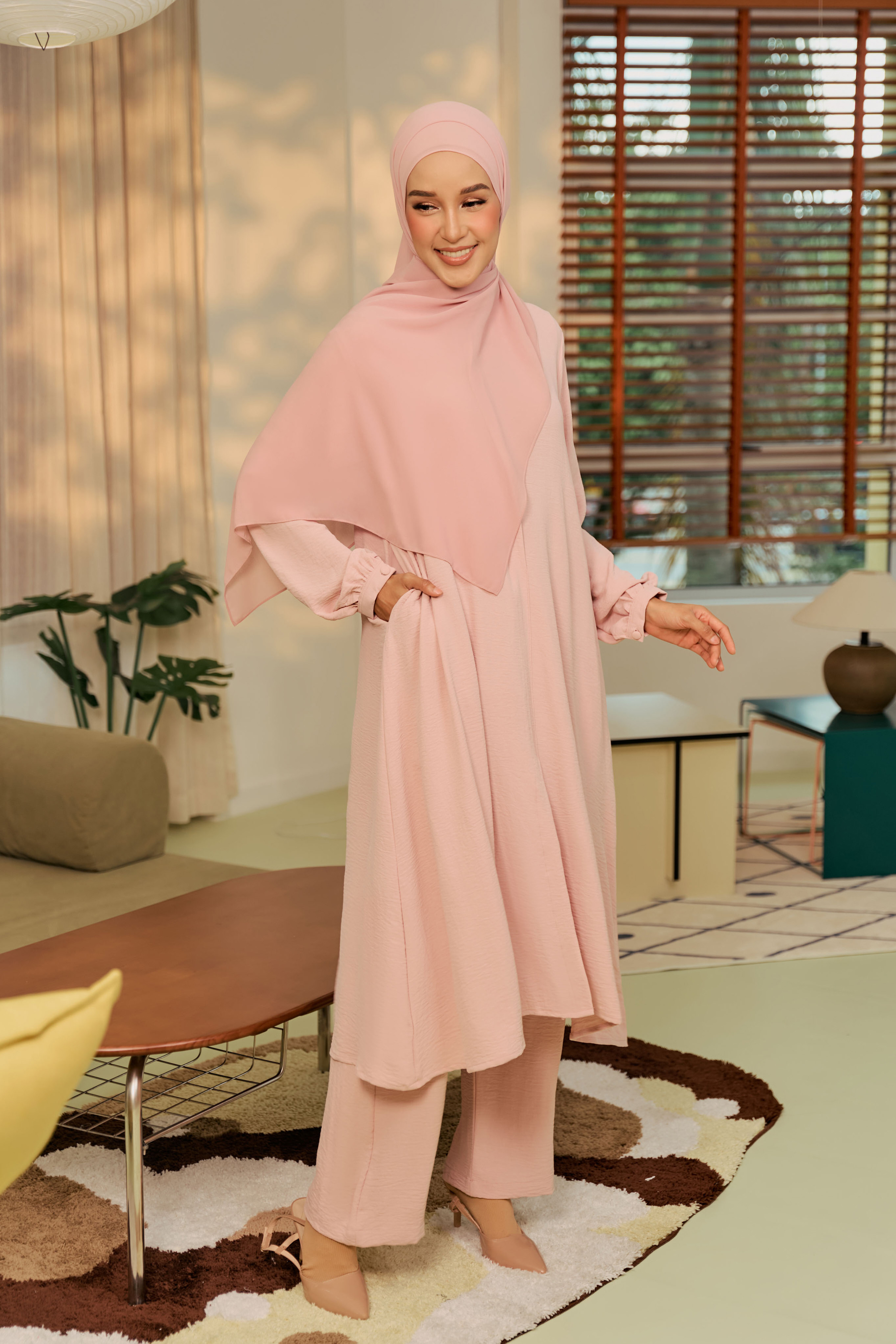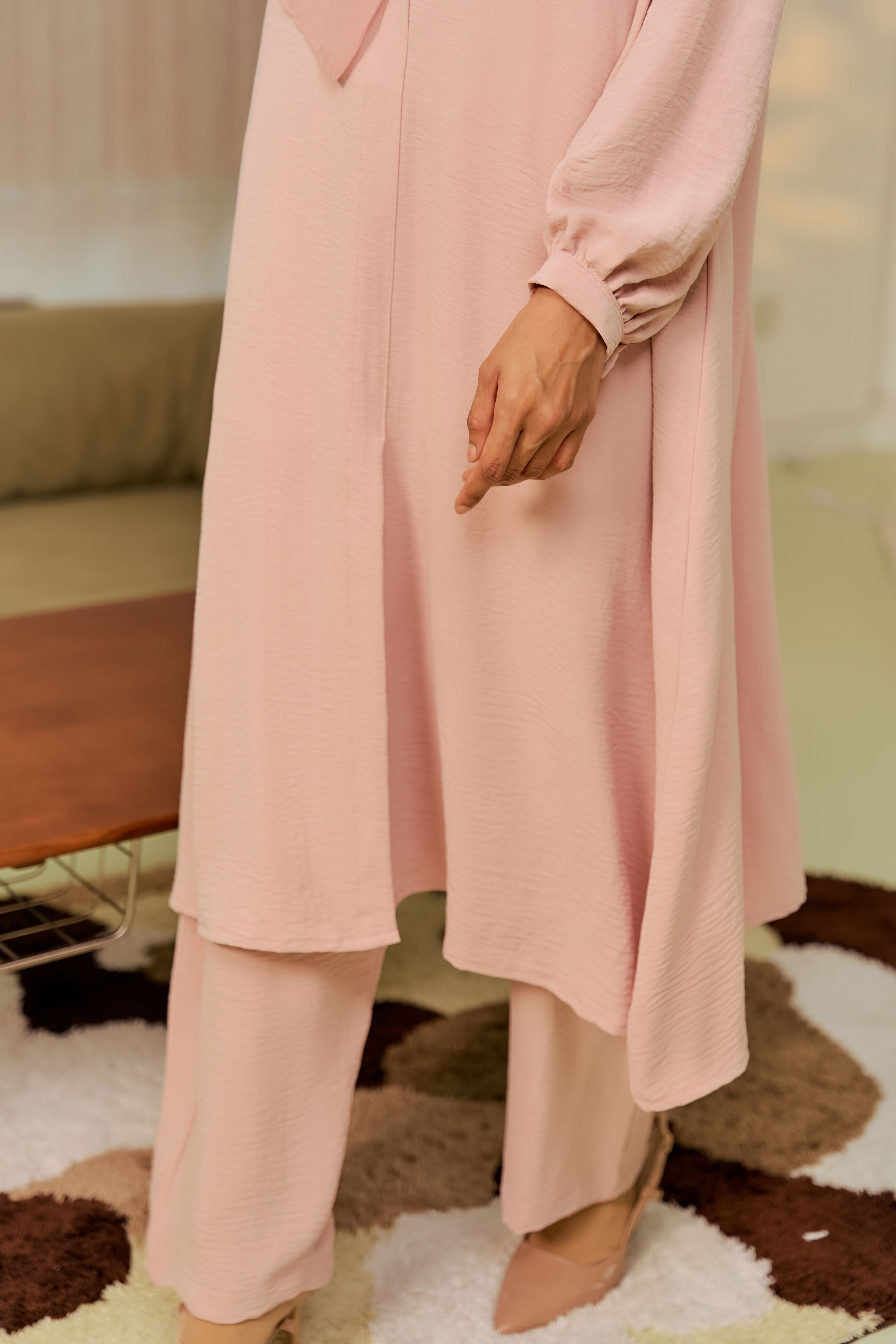 The Lana Set is a beautifully crafted modest wear set, perfect for those seeking comfort, style, and practicality. The Lana Set offers both style and practicality, crafted from premium Cey Crepe that requires minimal maintenance. The loose-fitting top, wudhu-friendly design, and comfortable pants with pockets make it a functional yet stylish option for everyday wear, religious duties, and travel. The Lana Khimar complements the set with its adjustable tie-back design, making it easy to wear and suitable for occasions like Umrah.