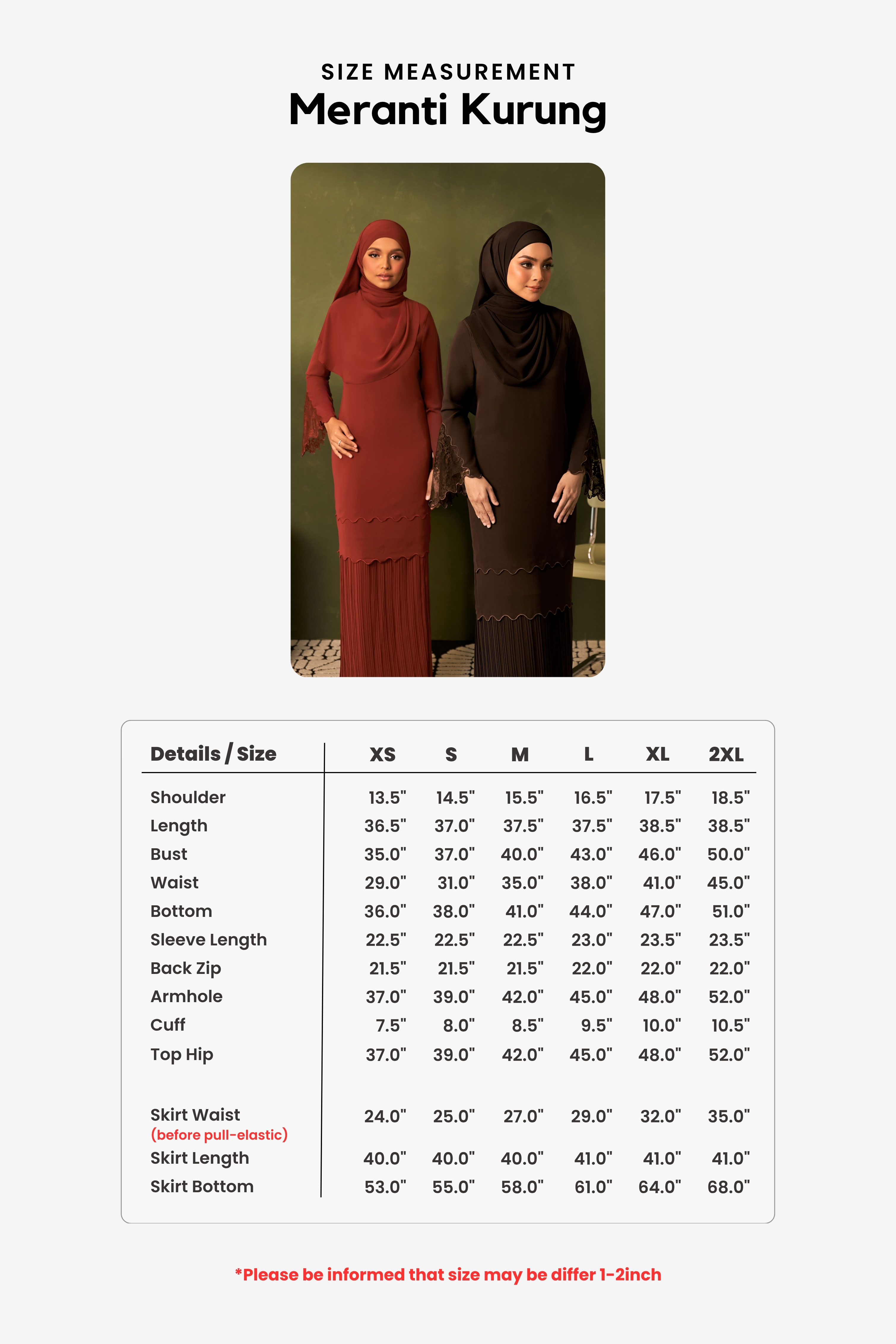 Crafted from premium Diamond Crepe, this modern kurung is designed for women who appreciate comfort without compromising elegance. With intricate lace detailing and a flowing pleated skirt, Meranti is your go-to piece for daily wear, bridesmaid duties, or even special moments like Hari Raya Haji.