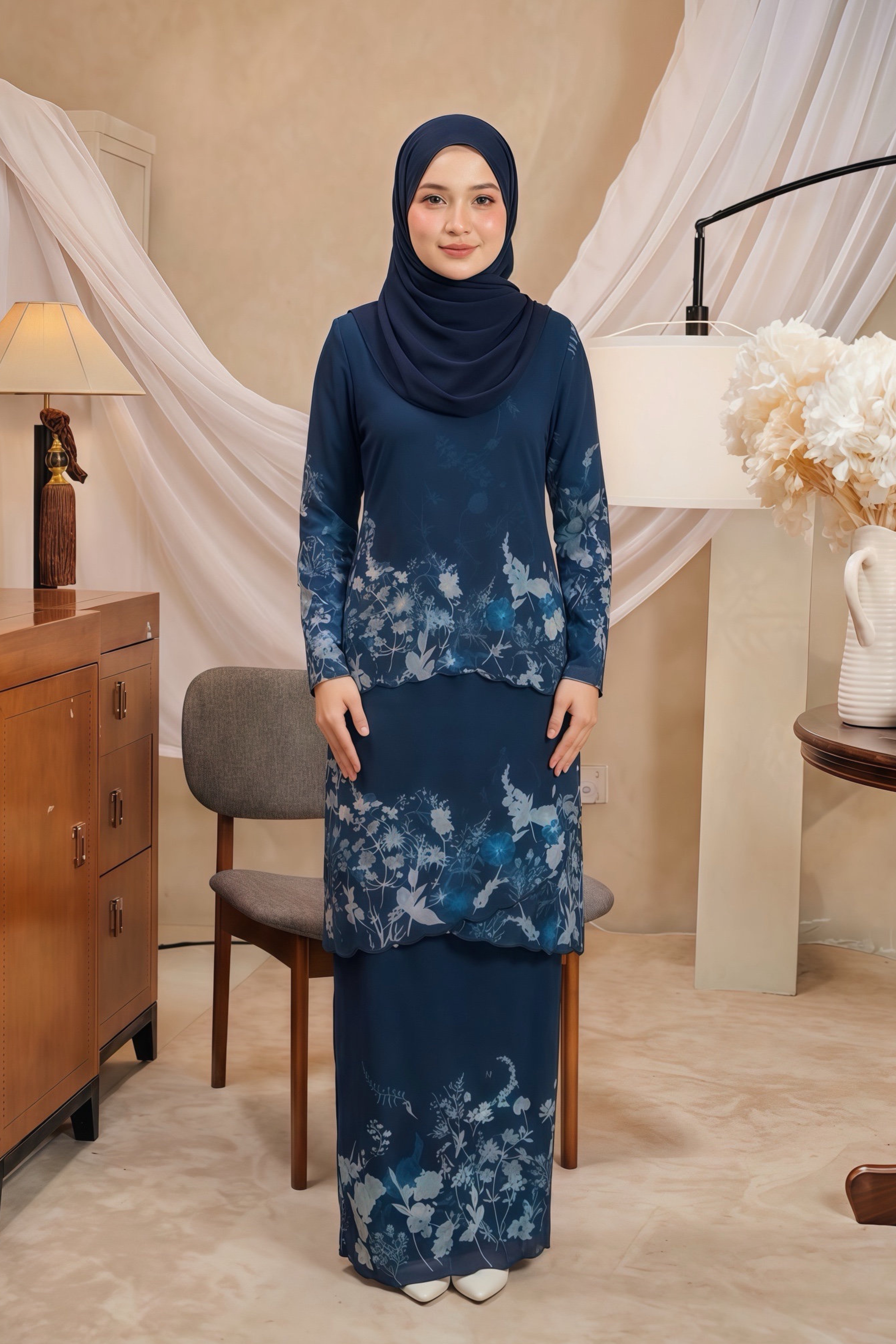 Grace your wardrobe with the refined allure of the Teja Kurung — a harmonious blend of modern sophistication and timeless tradition. Crafted with scalloped hemlines and adorned in delicate floral prints, each piece embodies effortless elegance and poise.