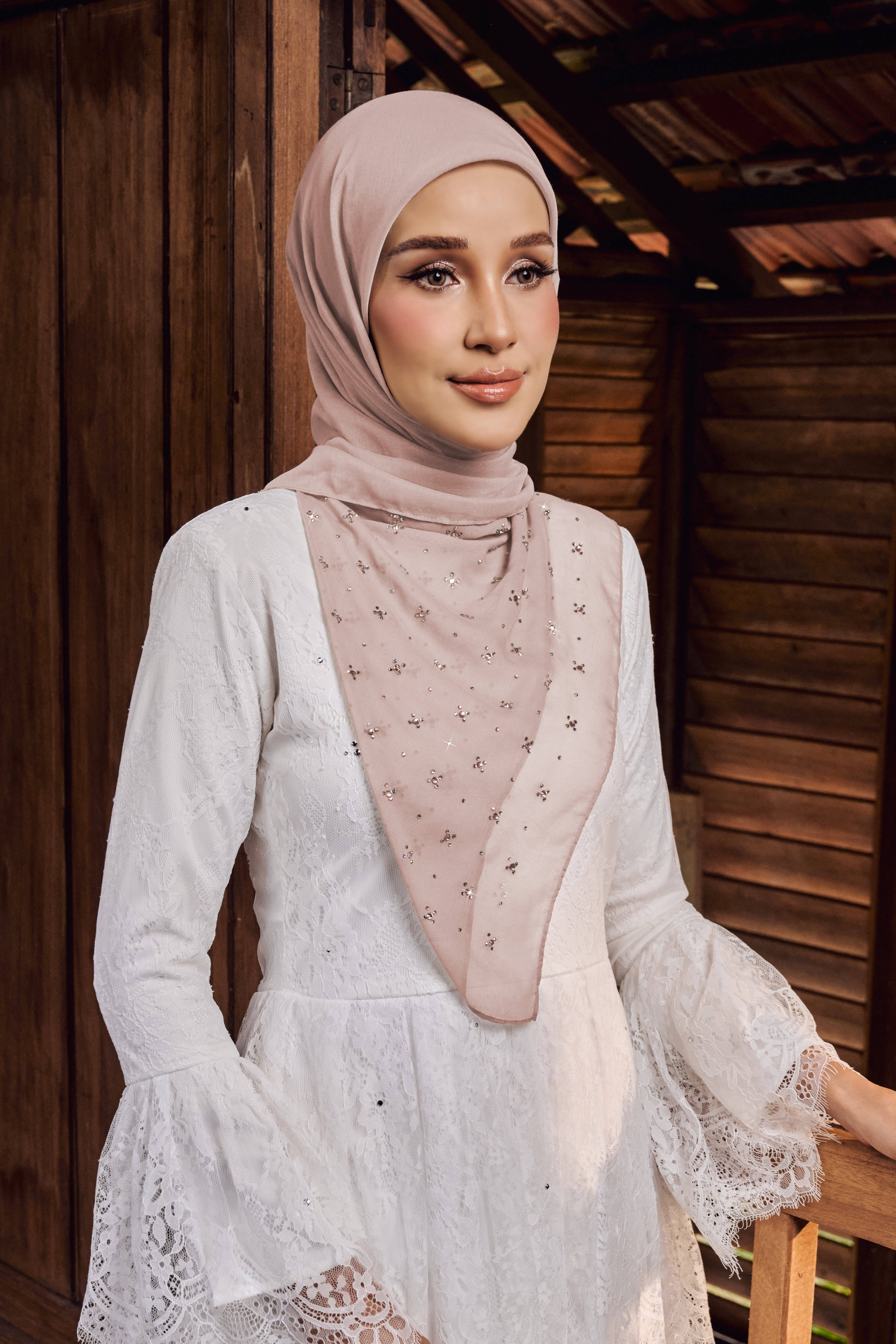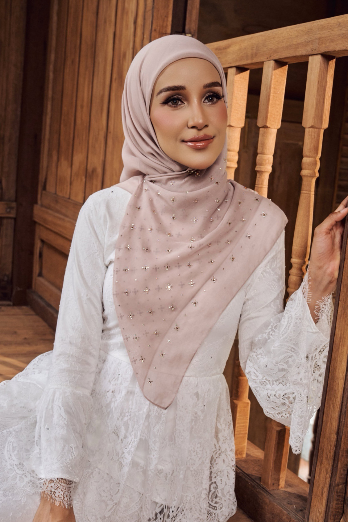 Dihiasi dengan susunan rhinestone crystal halus berkilau yang disusun dalam pattern bunga kecil empat kelopak, tersusun sekata dan seimbang di seluruh permukaan bawal. Setiap motif dihiasi titik kristal di tengah, memberi efek taburan bintang yang tampak lembut tetapi tetap menyerlah apabila terkena cahaya.