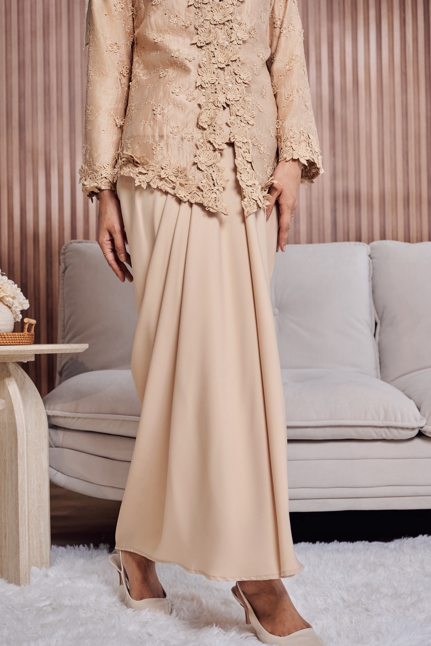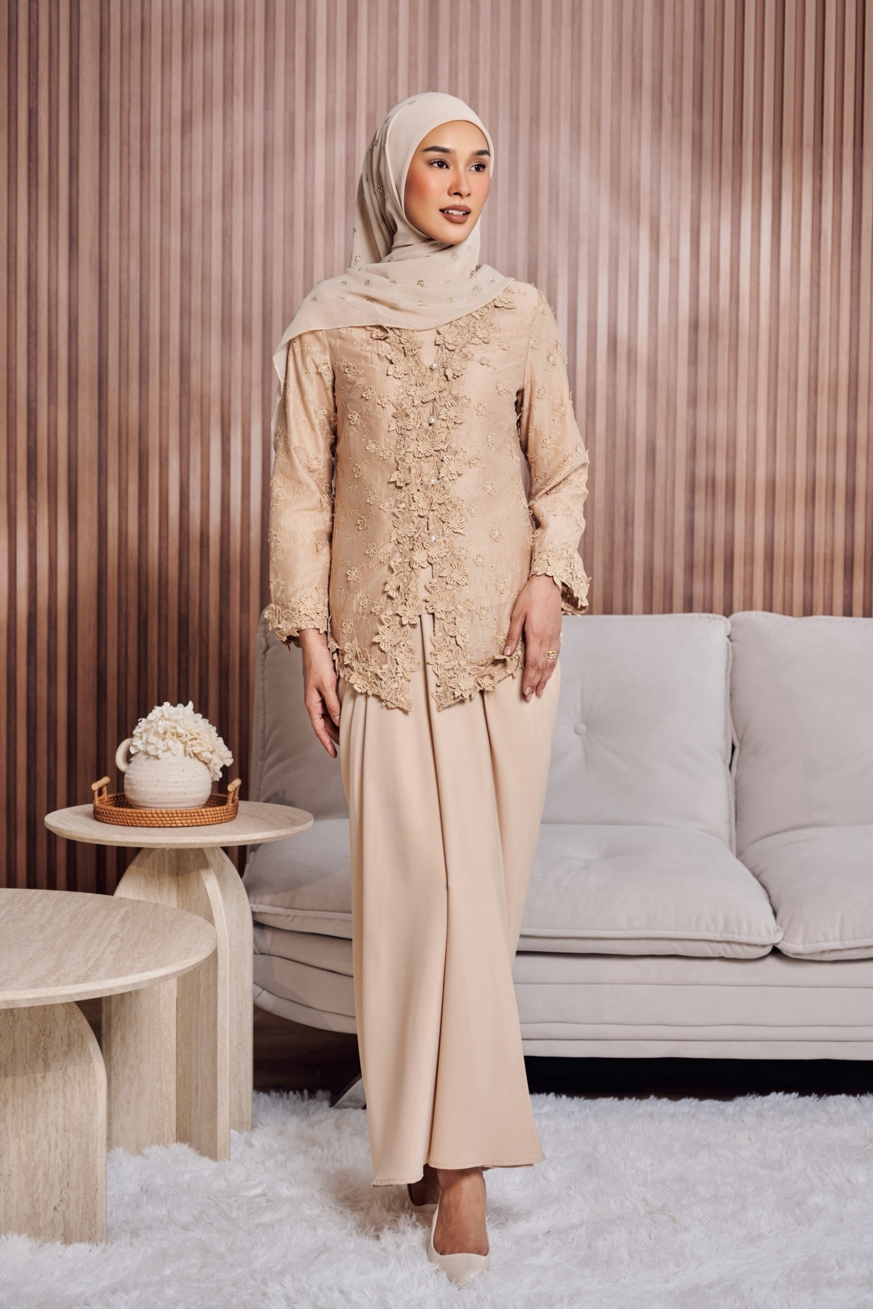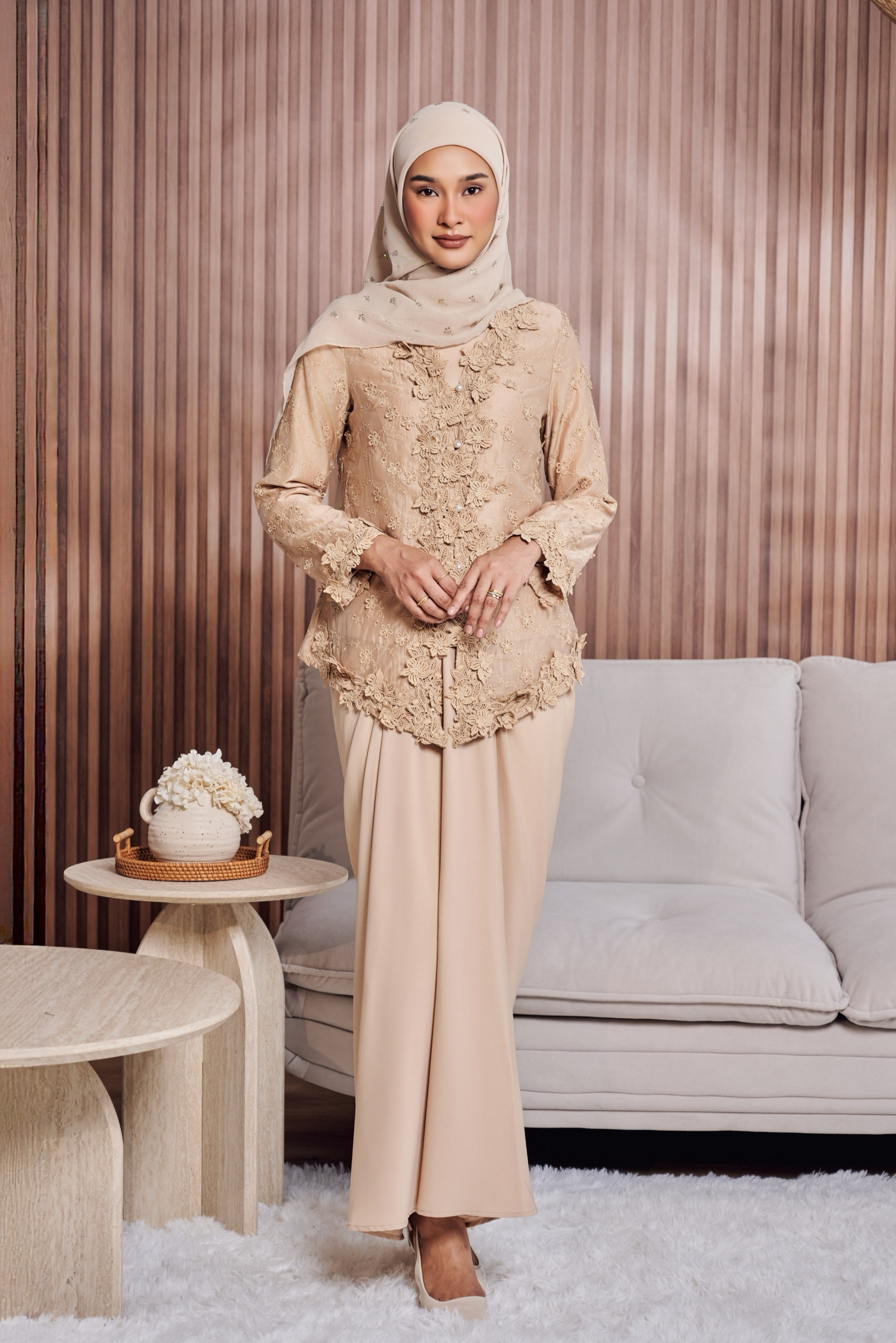 Diperbuat daripada material Poka yang lembut dan selesa, kebaya ini dihiasi dengan lace cotton bersama 3D embroidery yang memberikan tekstur mewah serta detailing yang memikat.