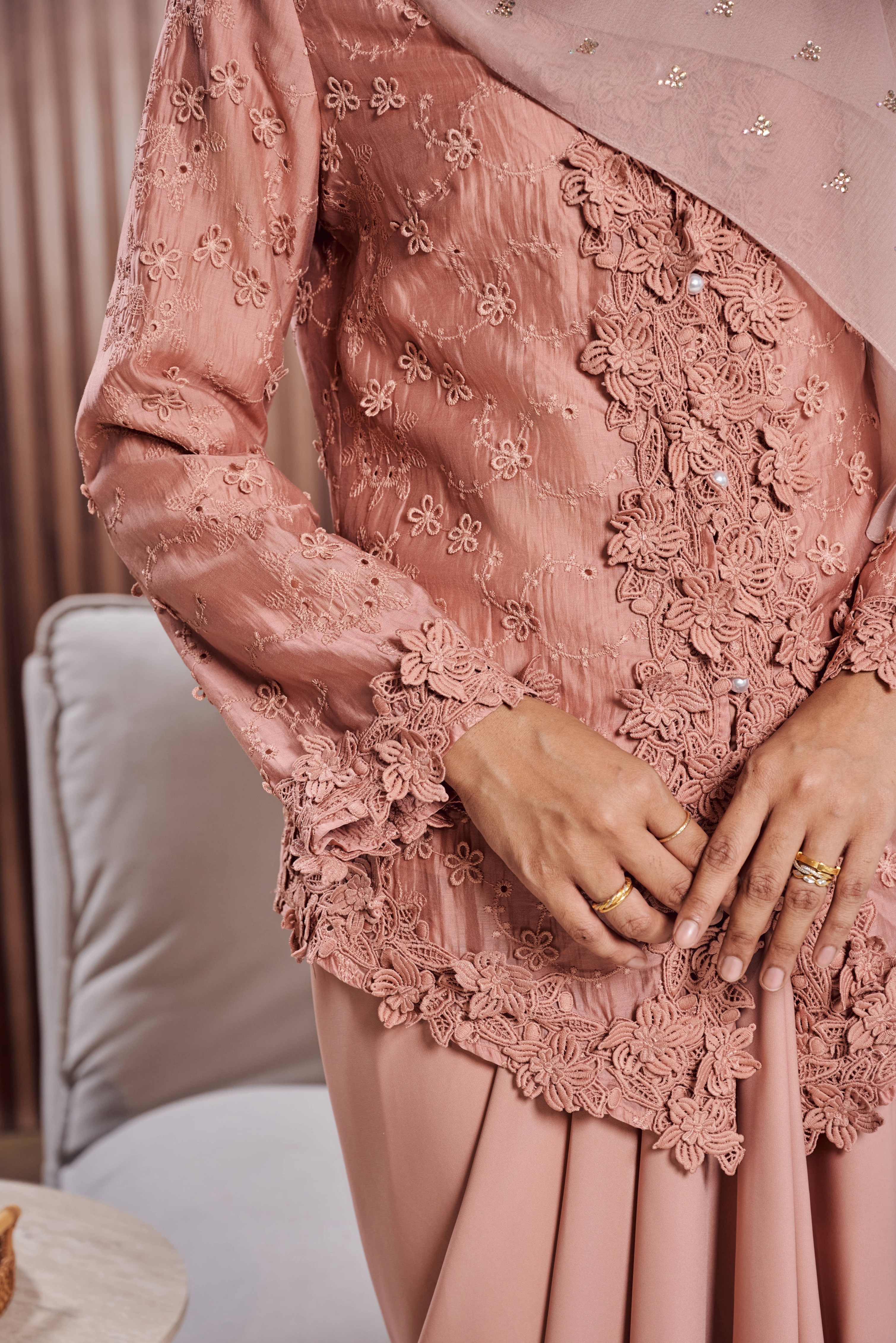 Diperbuat daripada material Poka yang lembut dan selesa, kebaya ini dihiasi dengan lace cotton bersama 3D embroidery yang memberikan tekstur mewah serta detailing yang memikat.