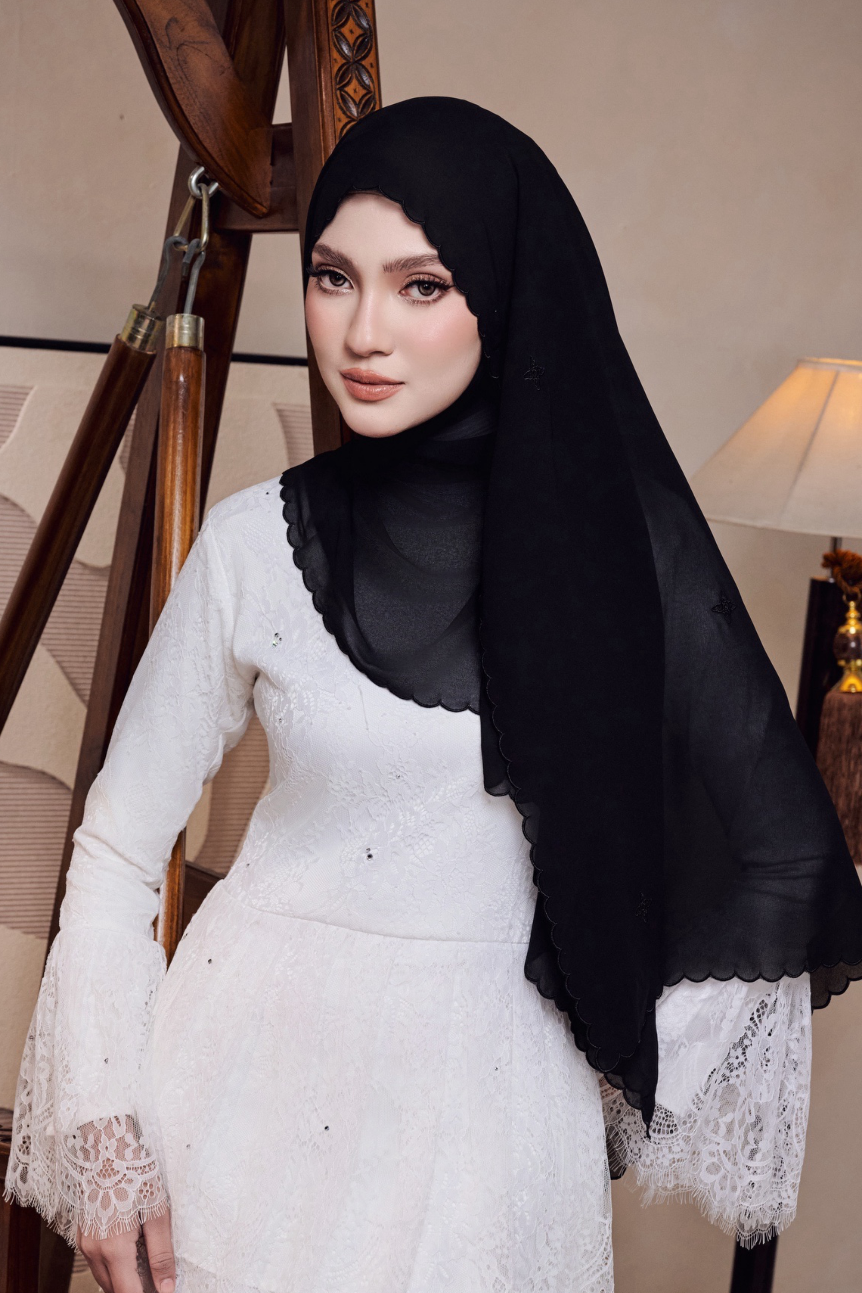 Dihiasi sulaman motif bunga Widuri minimal bertaburan sebagai signature detailing, serta kemasan scallop di sekeliling shawl untuk sentuhan feminin yang eksklusif.