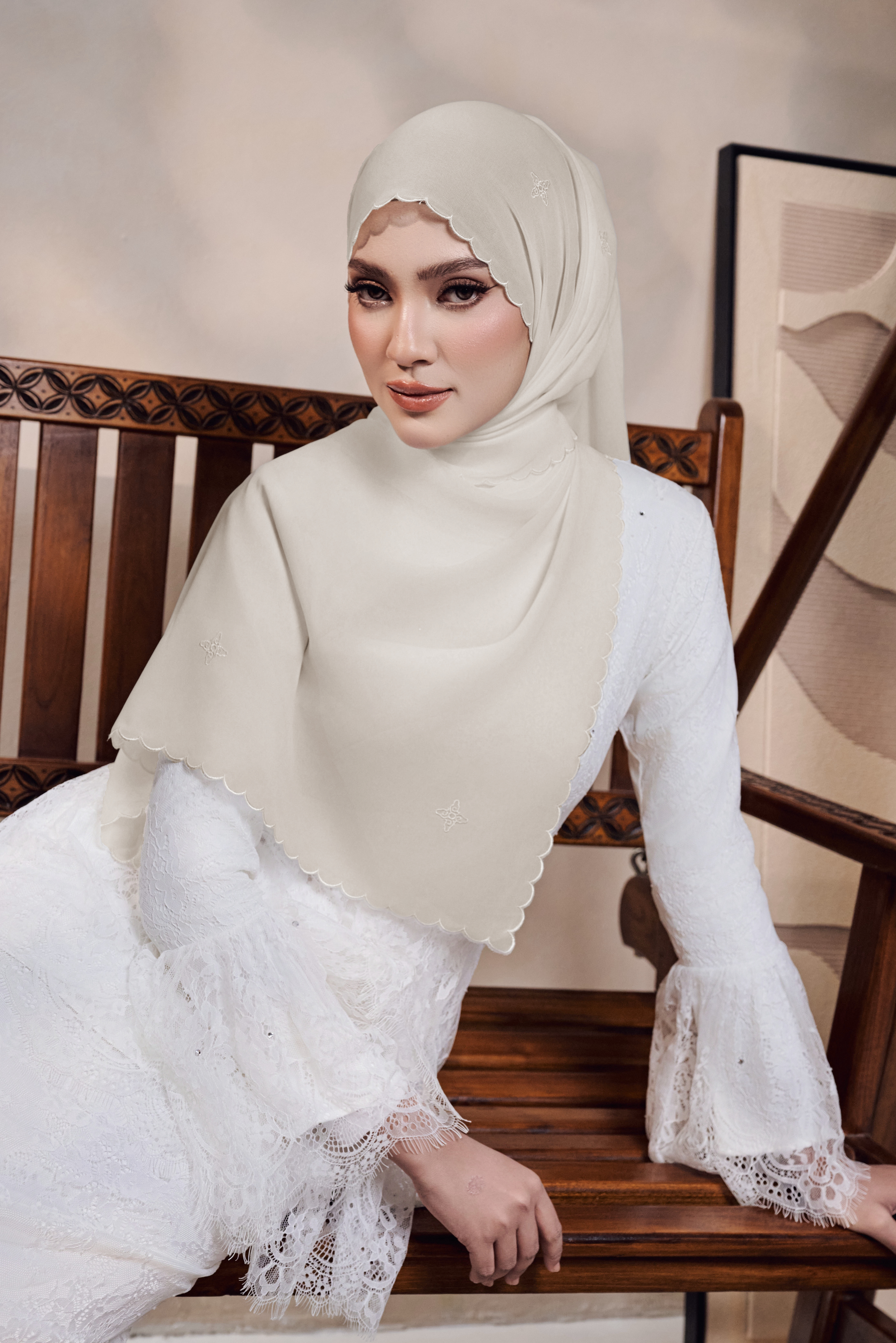 Dihiasi sulaman motif bunga Widuri minimal bertaburan sebagai signature detailing, serta kemasan scallop di sekeliling shawl untuk sentuhan feminin yang eksklusif.