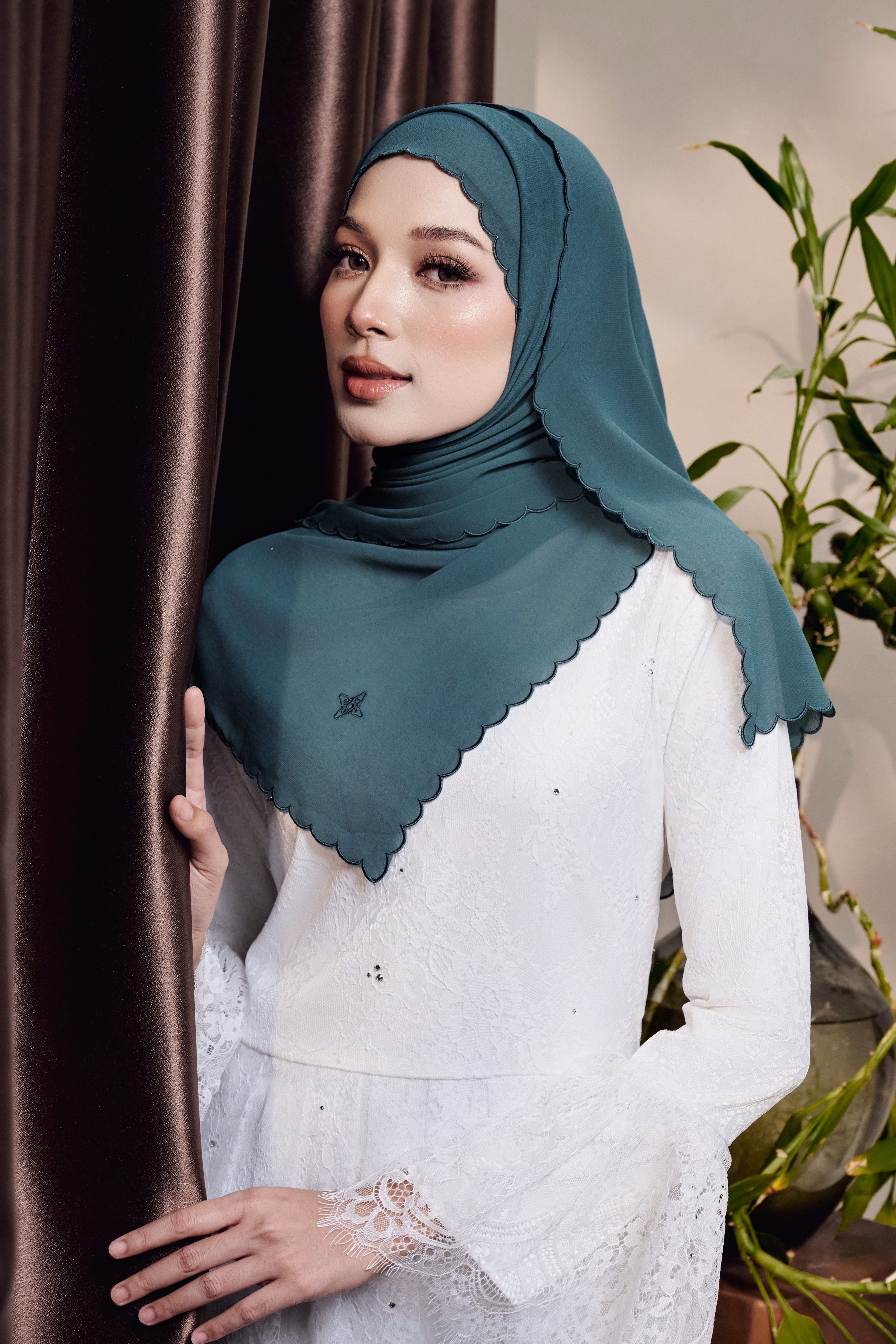 Dihiasi sulaman motif bunga Widuri minimal bertaburan sebagai signature detailing, serta kemasan scallop di sekeliling shawl untuk sentuhan feminin yang eksklusif.