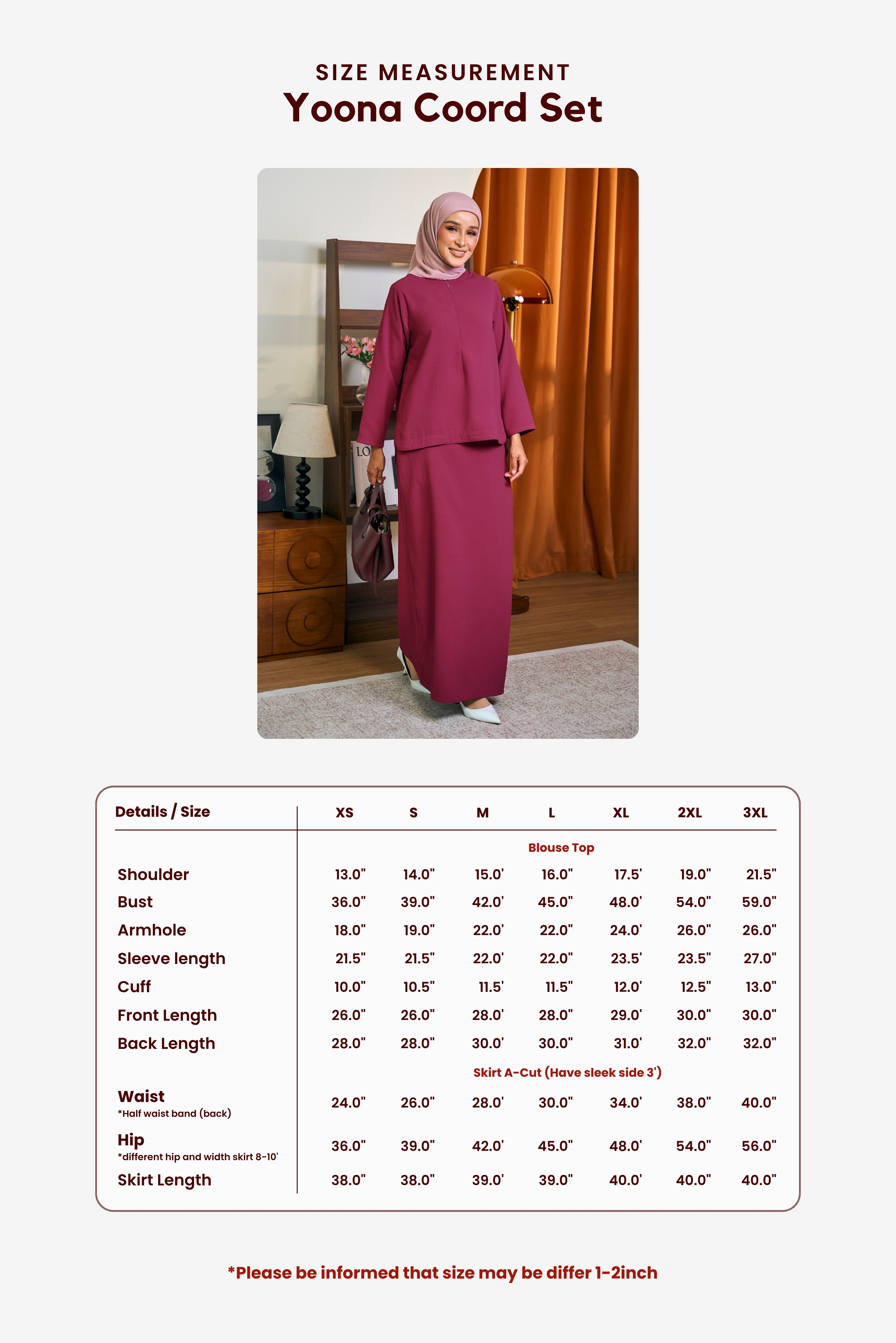 -Saiz mungkin berbeza 1–2 inci bergantung pada proses jahitan.-Saiz mungkin berbeza 1–2 inci bergantung pada proses jahitan.